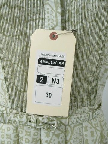 Emma Thompson virtually steals the show in "Beautiful Creatures" (2013) playing both Mrs. Lincoln, a reactionary church lady, as well as the sexy and powerful witch Sarafine (star Alice Englert's mother) who "hides" in Mrs. Lincoln's body! This is Mrs. Lincoln hero screen worn conservative outfit as Mrs. Lincoln. It is a pleated front day dress with cream thin summer jacket. Comes with the original production wardrobe tag.