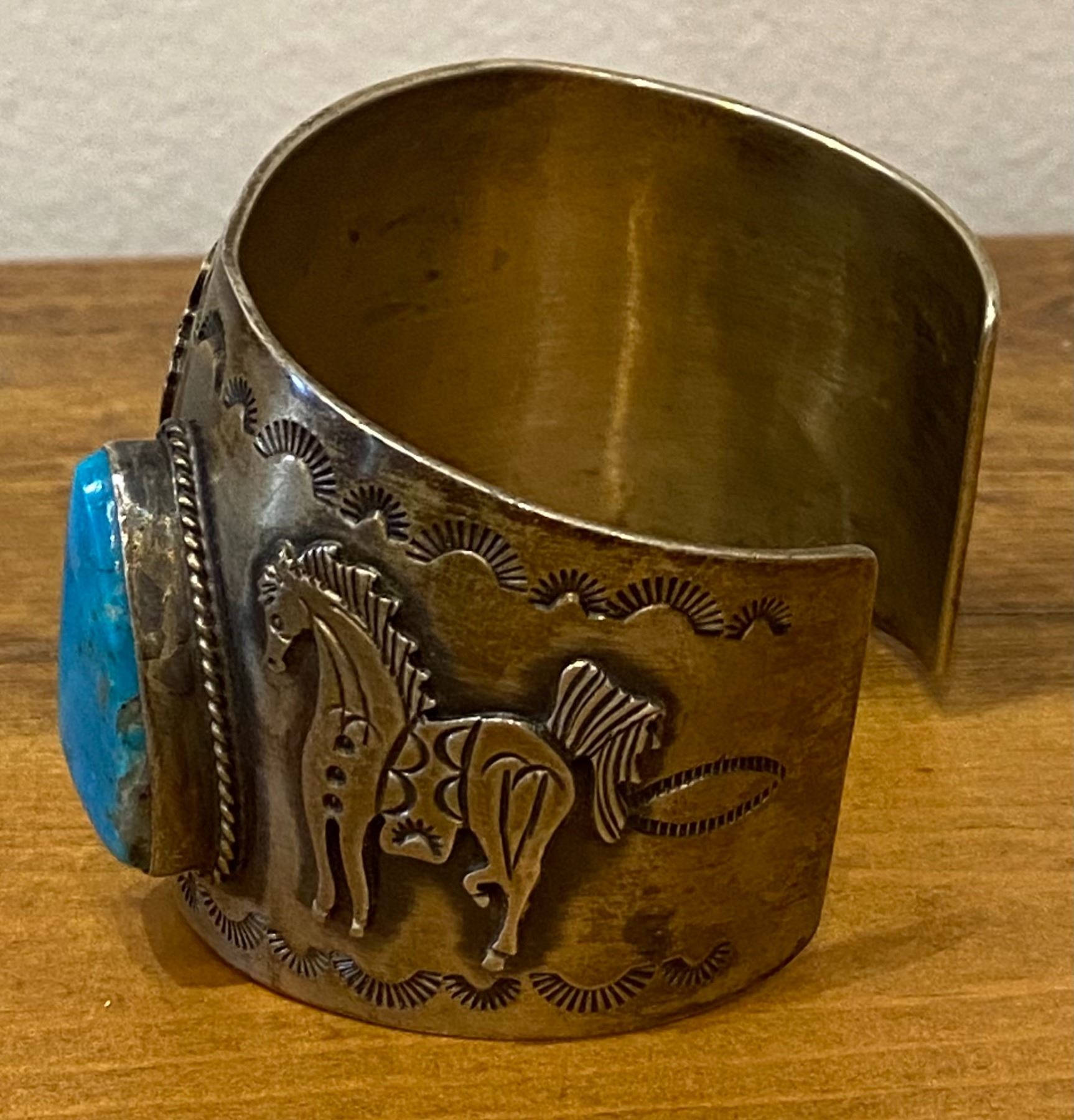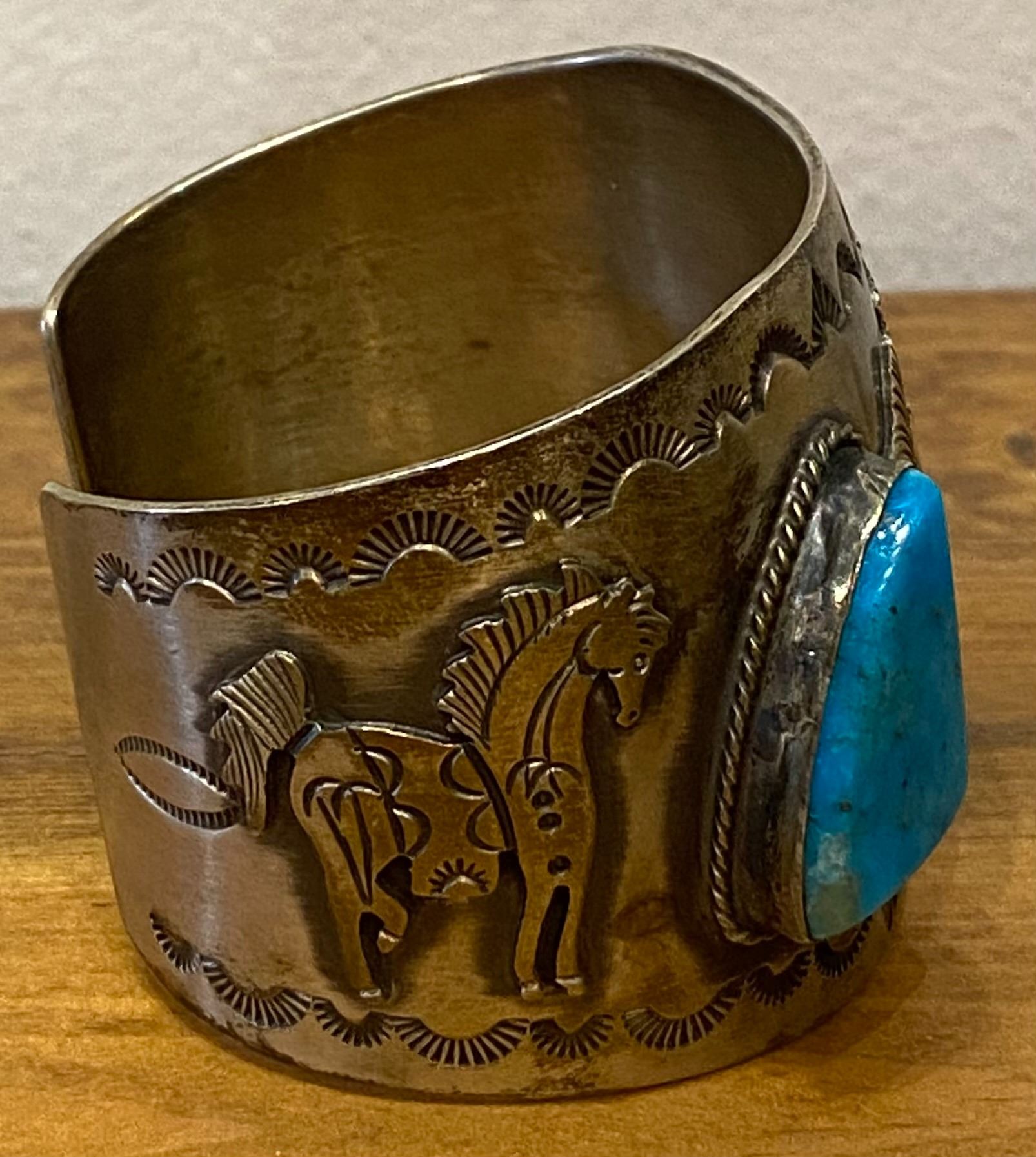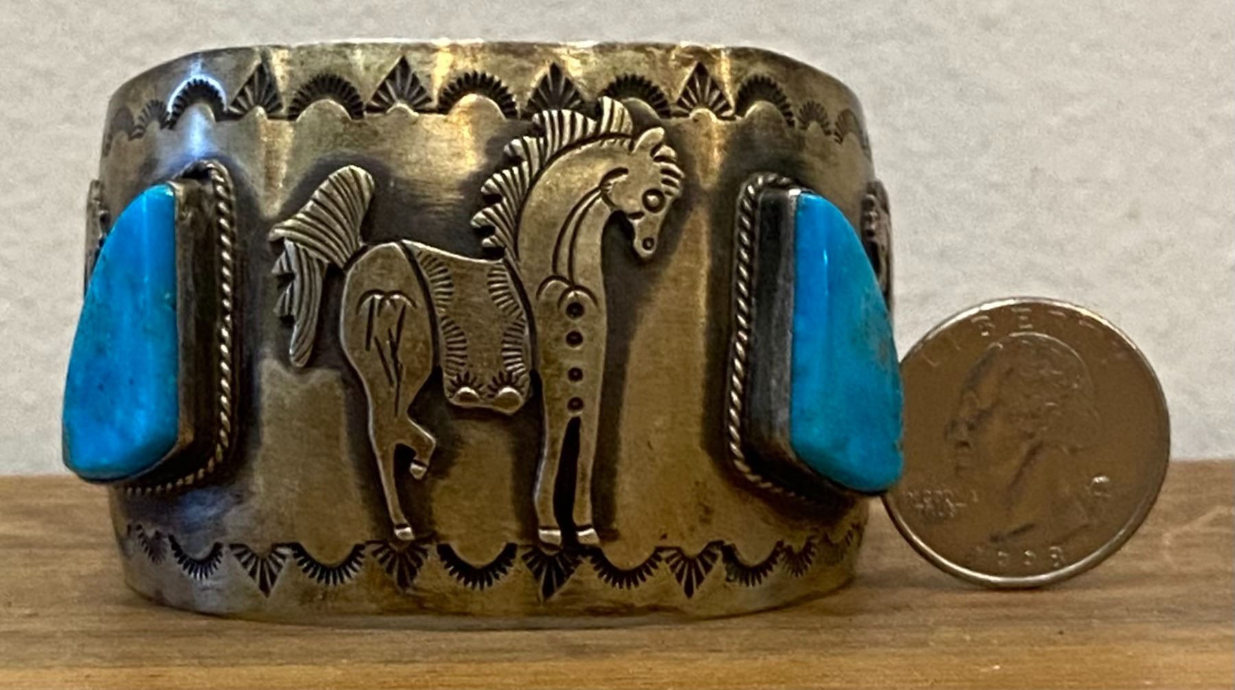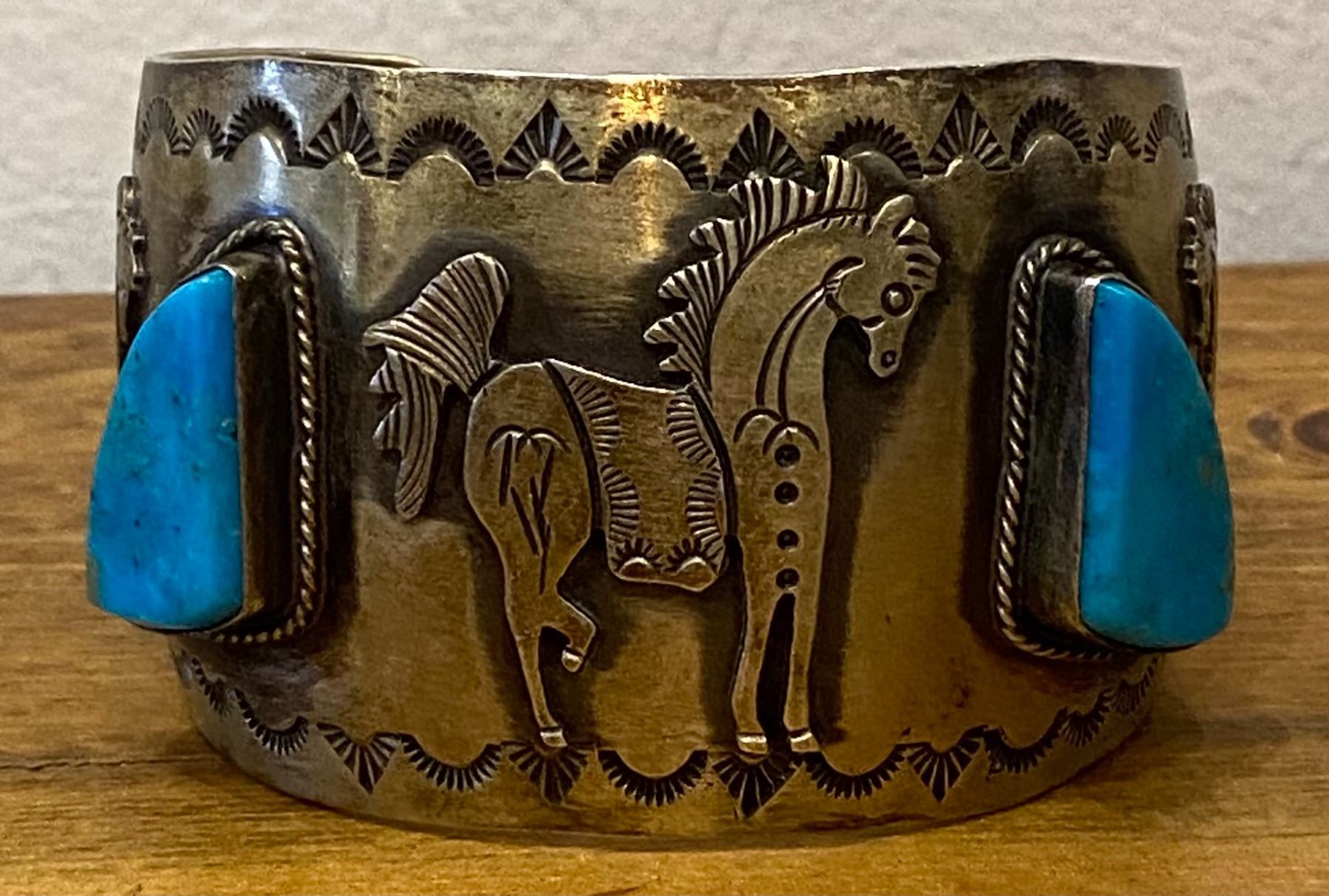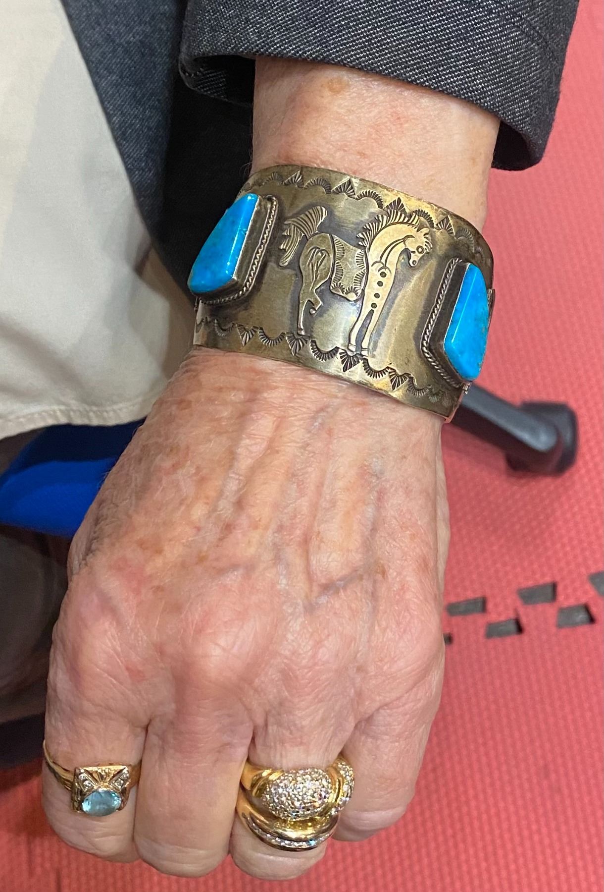 Bracelets measurements are opening, inside circumference, height. Weights are in Grams and are weighed to the best of our ability. The term signed means that, in our opinion, the signature is by the artist. All dating, Turquoise and hallmark attributions are to the best of our knowledge. Attributions are subjective and should be taken as such. Attributions in the description of any lot is left to the buyer to determine accuracy and the gallery is not responsible for any errors or omissions.