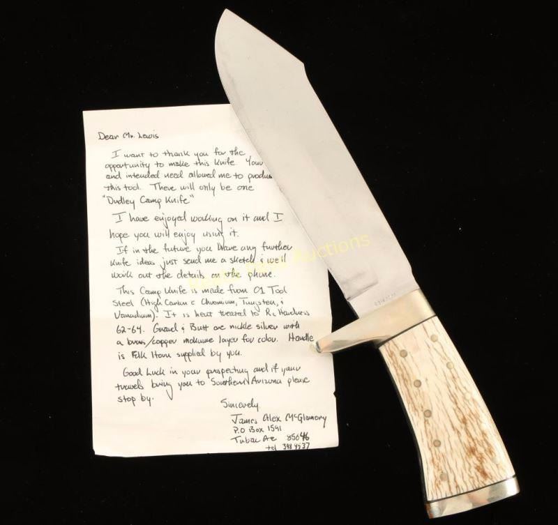made by James Glamory, marked J.A.MCG, antler handled, named the Dudley Camp Knife, thick high polished blade, includes a letter from the knife maker, measures 12 1/2"overall with a 7" blade, very high quality knife.