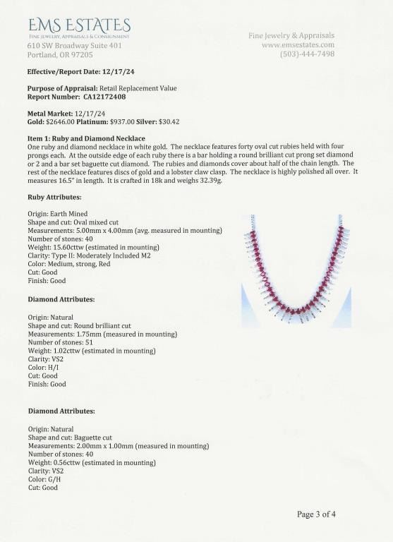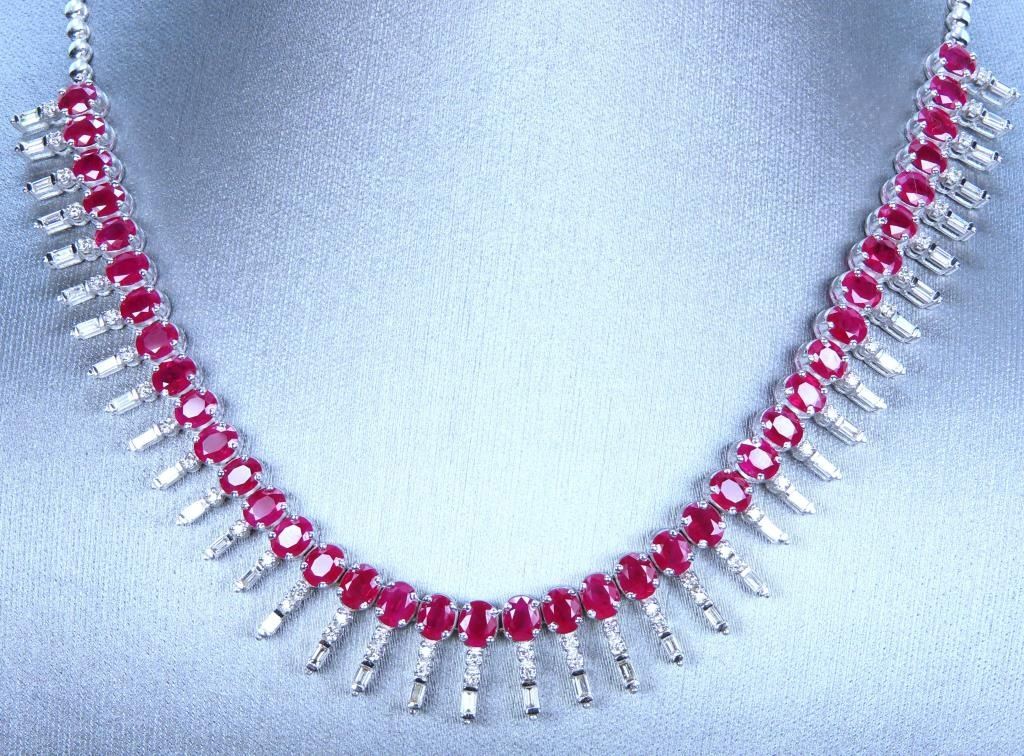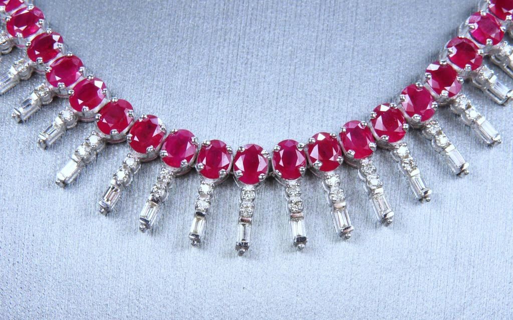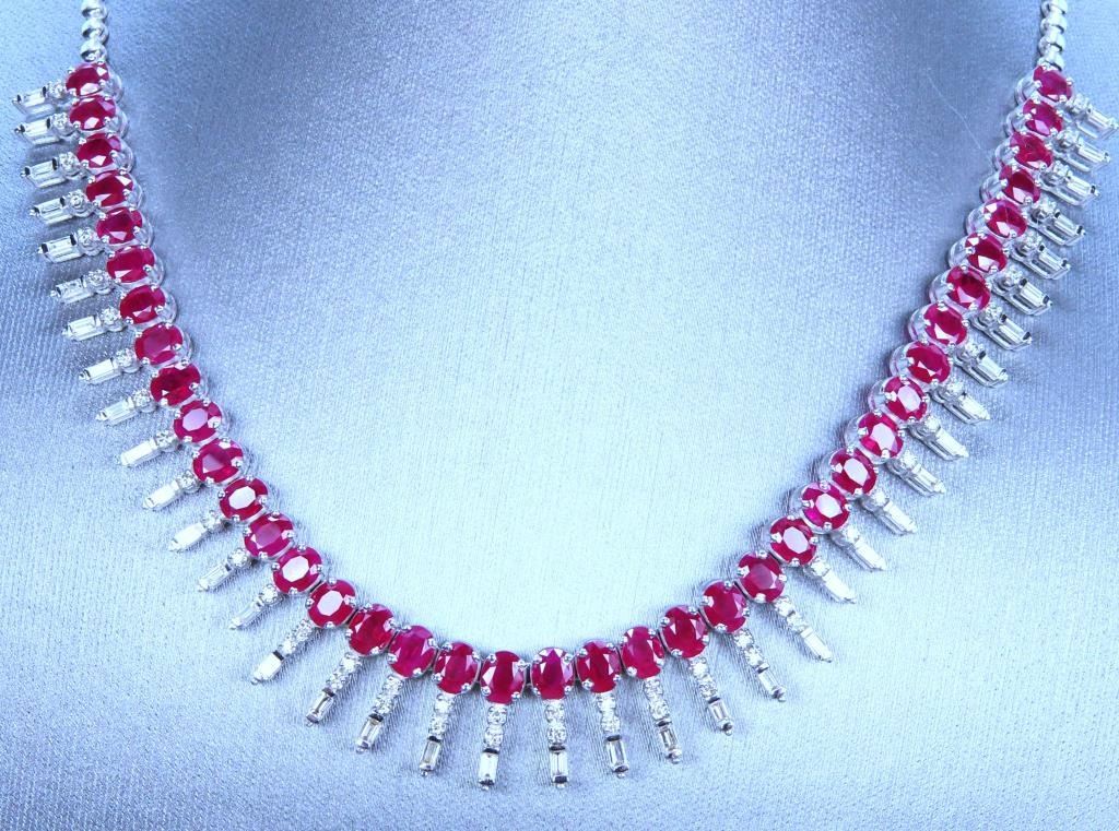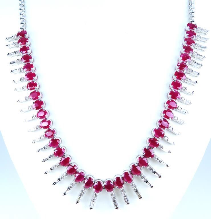 Diamond Necklace featuring 40 oval cut NO Treatment Natural Vivid Red Burmese Rubies weighing approx. 15.60 carats accented with 91 round and baguette cut Diamonds weighing approx. 1.58 carats with G-H colors and VS clarity set in a contemporary setting weighing 33.00 grams of 18 karat white gold. Full Appraised Retail Value - $26,500.00