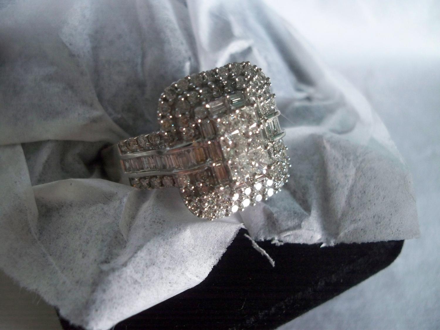 Beautiful Diamond Ring. 5.5 CT VS Diamonds with lovely F color set into a 14 K white gold band.