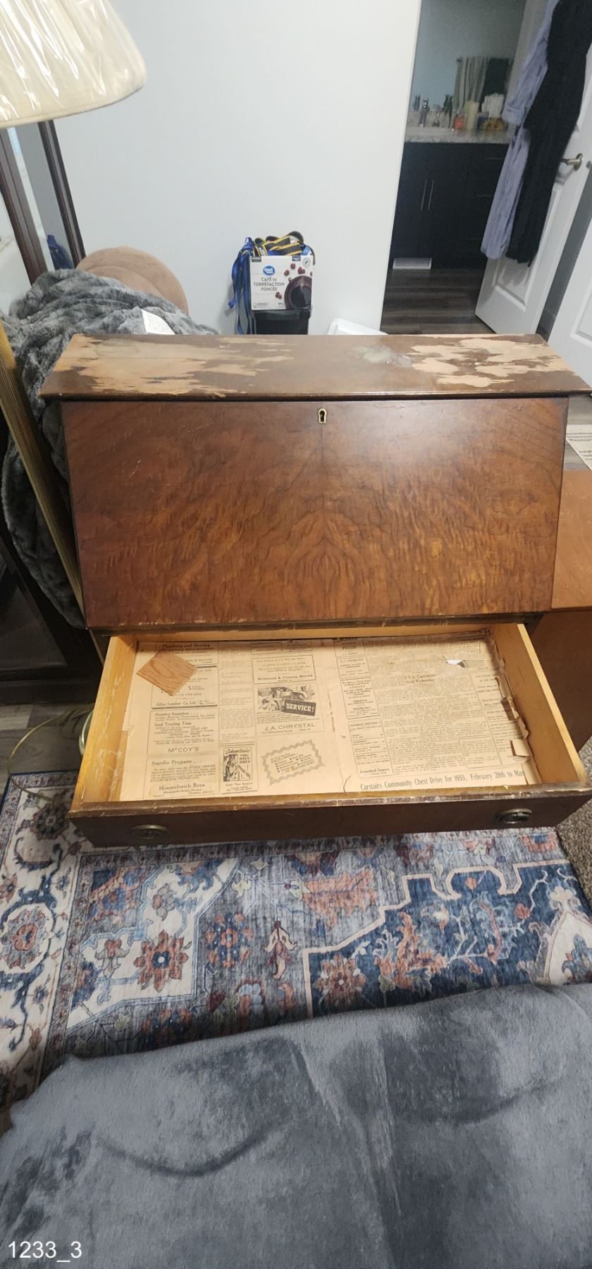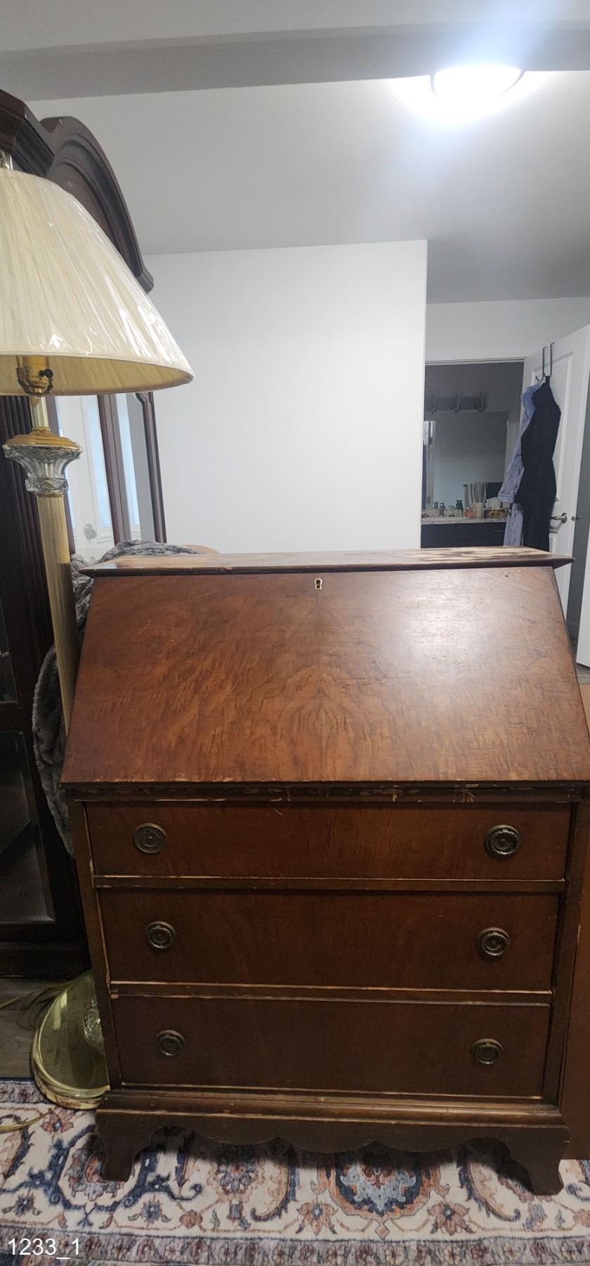 Beautiful Drop Down Desk. Needs some restoration and TLC. Three drawers with storage in desk top.