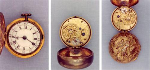 Belle montre de poche anglaise, double boîte en laiton doré, cadran en émail avec chiffres romains pour les heures et arabes pour les minutes, échappement roue de rencontre, env. 1750