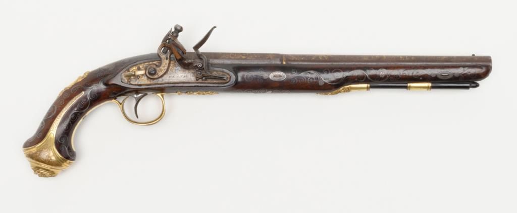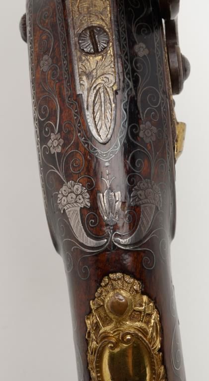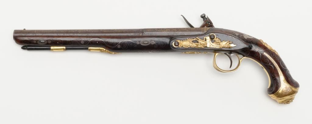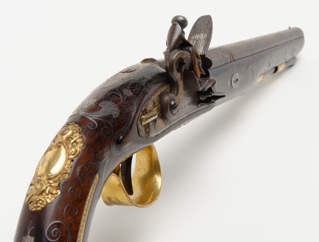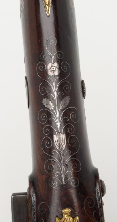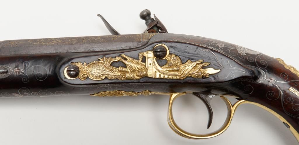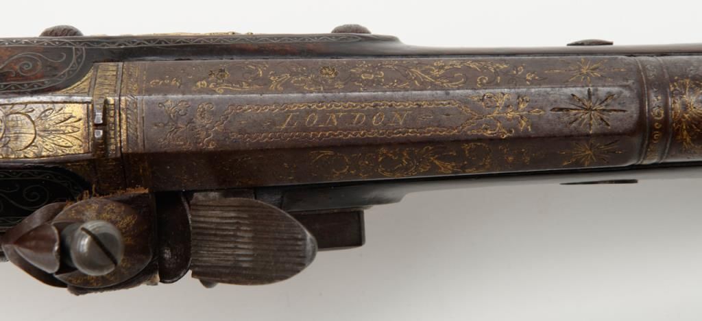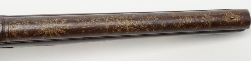Beautiful English flintlock pistol by Blanch, .60 cal., 18-1/2” overall with a 12” octagon to round barrel extensively engraved and gold decorated, London marked, crisp action with gold wash to hammer and lockplate also; mountings are gold gilt and fancy; the wood stock is overall very good to near fine with a deep patina and extensive silver wire decorations and double keyed to barrel. A striking piece in appearance and of quality workmanship; ebony ramrod is missing tip coverpiece that likely was ivory or bone to accent the rest of the pistol. (Antique). Est.: $2,500-$5,000.