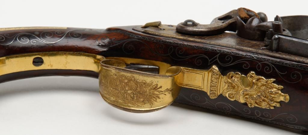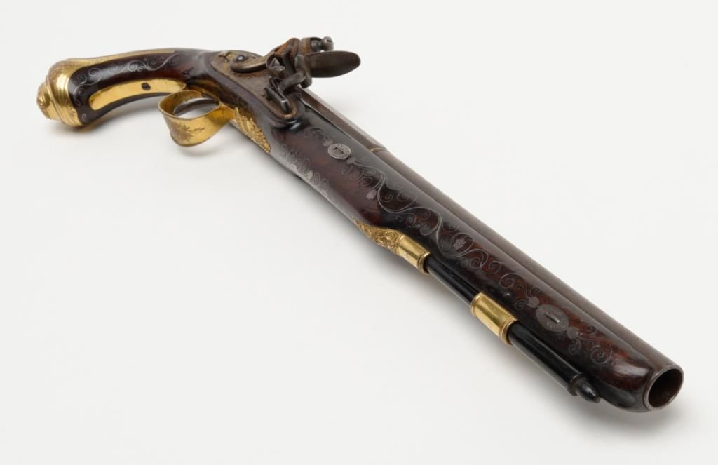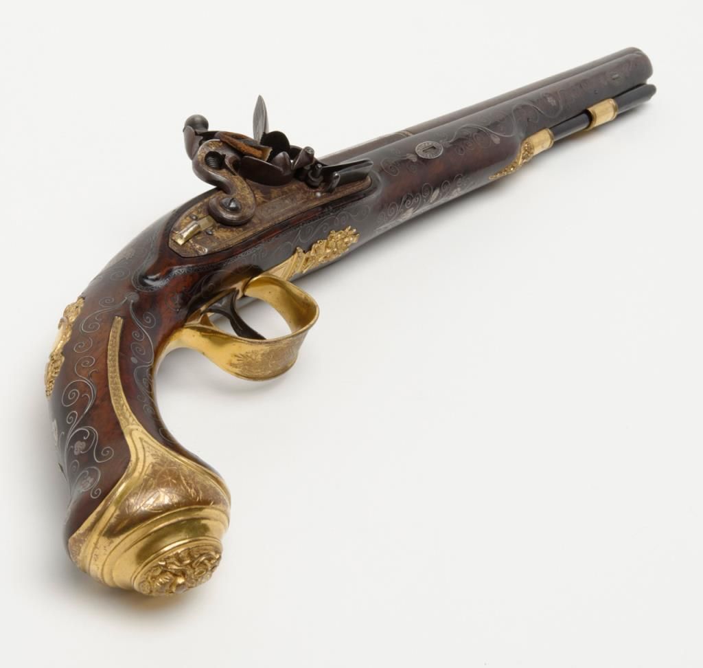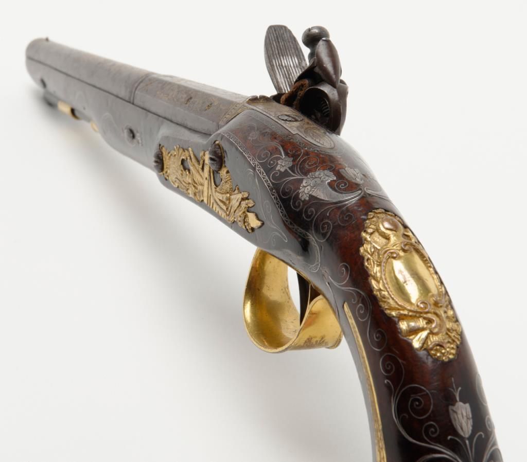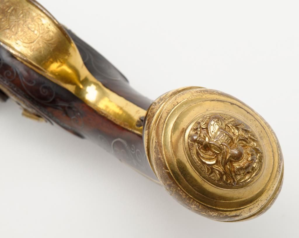 Beautiful English flintlock pistol by Blanch, .60 cal., 18-1/2” overall with a 12” octagon to round barrel extensively engraved and gold decorated, London marked, crisp action with gold wash to hammer and lockplate also; mountings are gold gilt and fancy; the wood stock is overall very good to near fine with a deep patina and extensive silver wire decorations and double keyed to barrel. A striking piece in appearance and of quality workmanship; ebony ramrod is missing tip coverpiece that likely was ivory or bone to accent the rest of the pistol. (Antique). Est.: $2,500-$5,000.