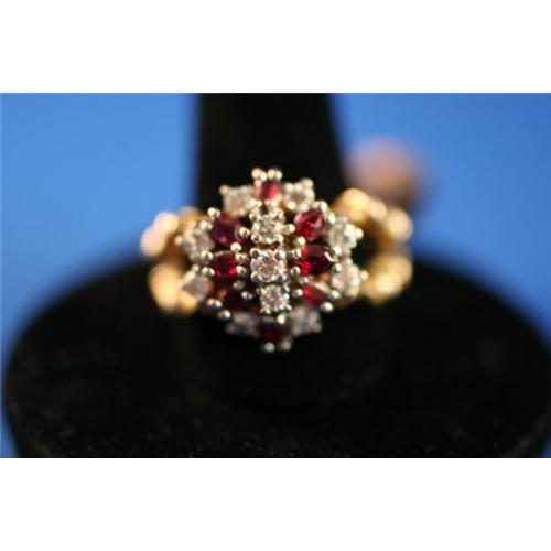 This is a pretty and classic ring of .23 carats of white diamond and .24 carats of red ruby. The shoulders of this ring are done in a bamboo pattern. This really beautiful ring weighs 6.1 grams and is a size 8 ( sizable by me or by your jeweler). International shipping cost will vary. Paypal only for international orders.