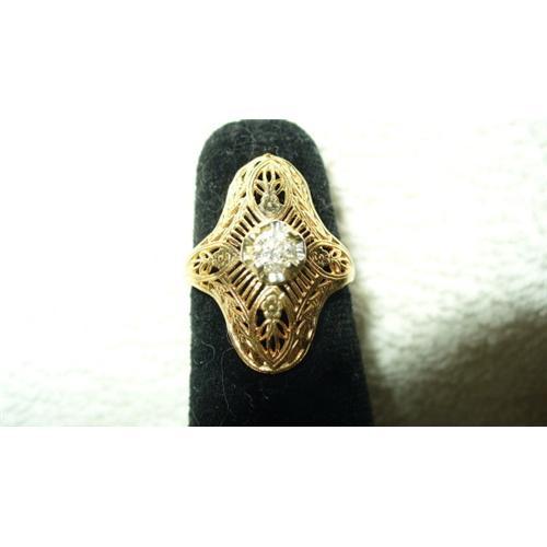 </font></strong>This beautiful 14kt yellow gold filigree ring makes an outstanding statement. It has 4.5mm .33ct out standing diamond in the center.I can not say enough for the workmanship of this ring. I was told it was from the 1940's.The pictures just do not do justice. </font>