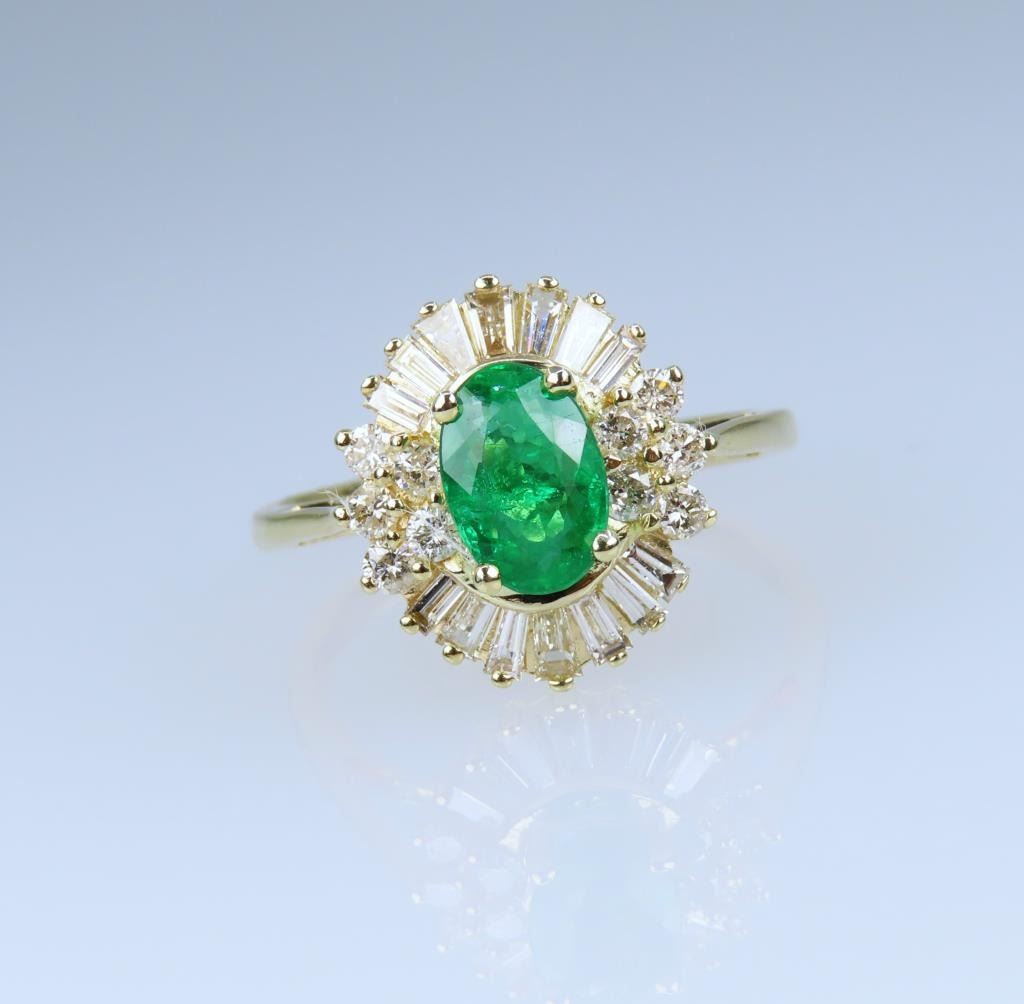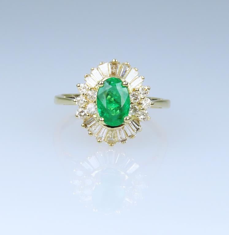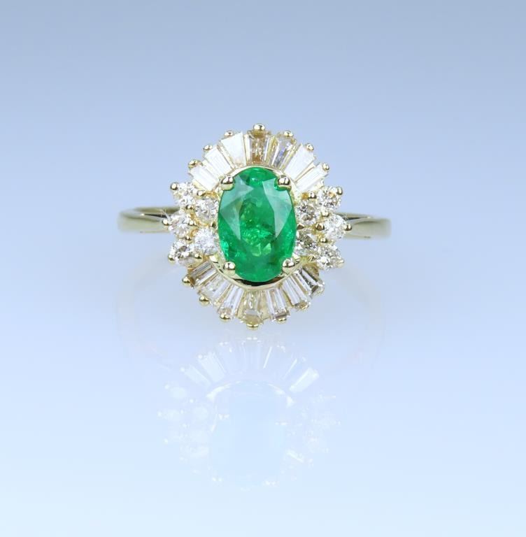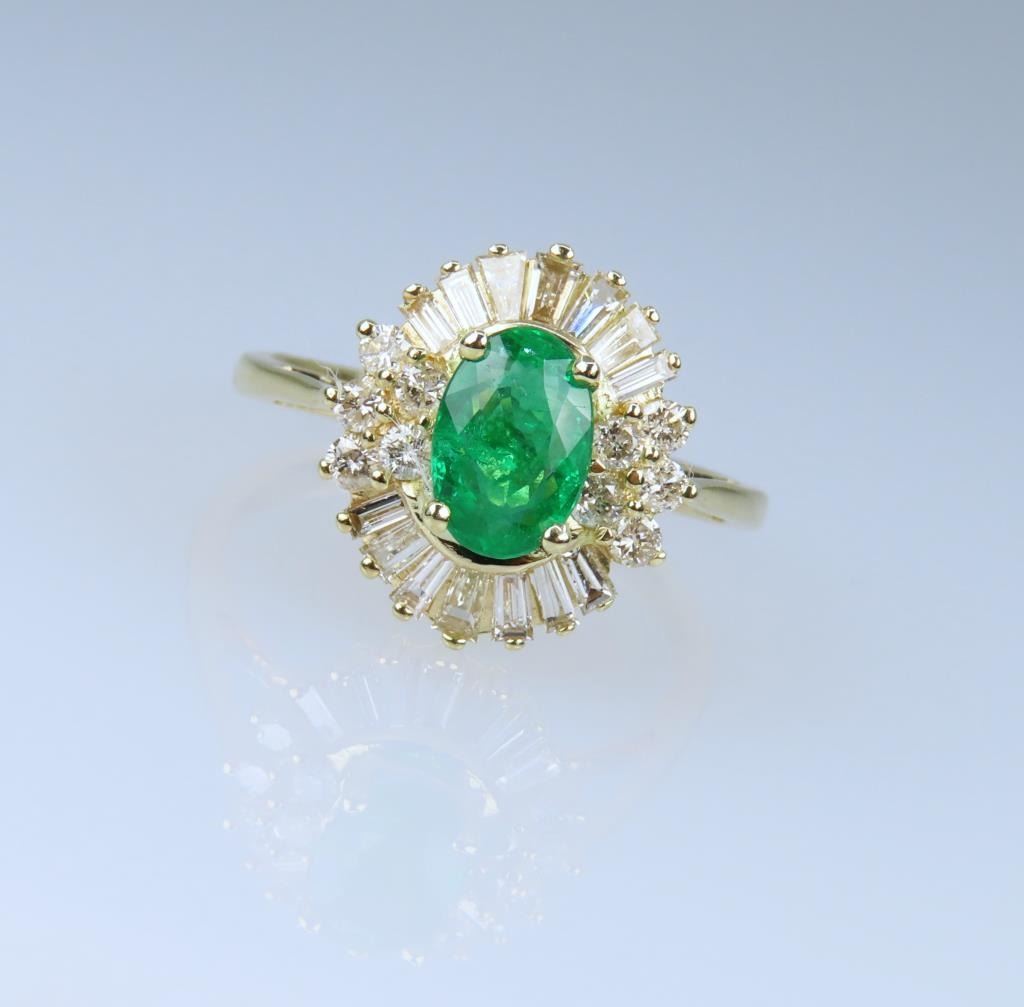 Diamond Ring featuring an oval cut Vivid Green Emerald weighing approx. 1.00 carat framed with 24 baguette and round cut Diamonds with G-H colors and VS-SI clarity weighing approx. 1.00 carats set in 14 karat yellow gold setting, ring size 6. Retail $4,000-$6,000