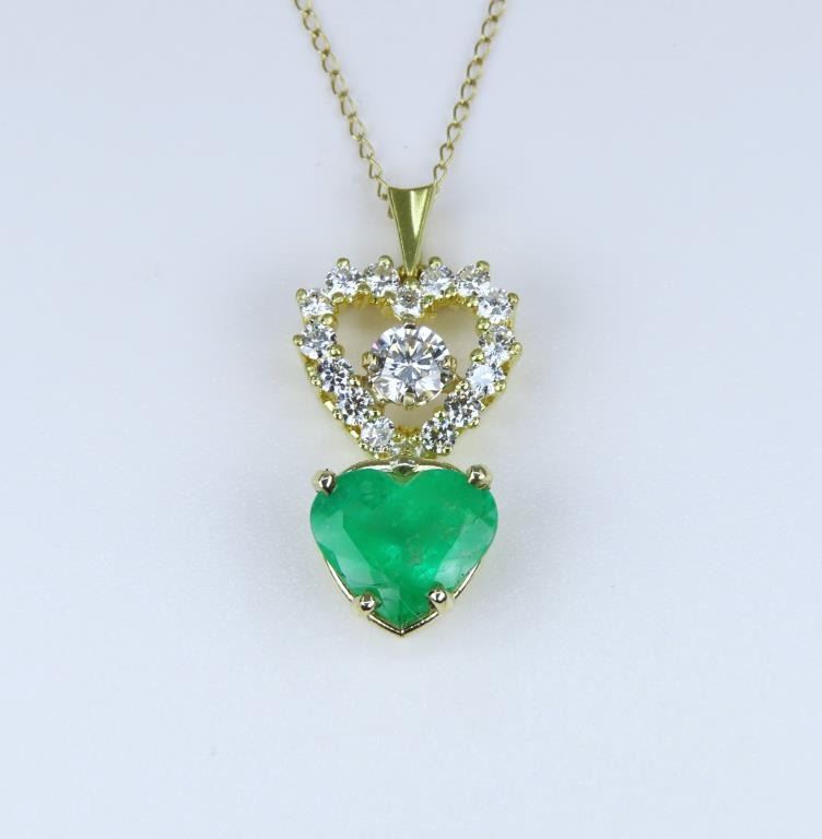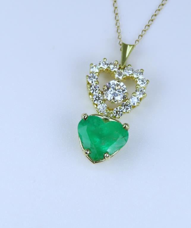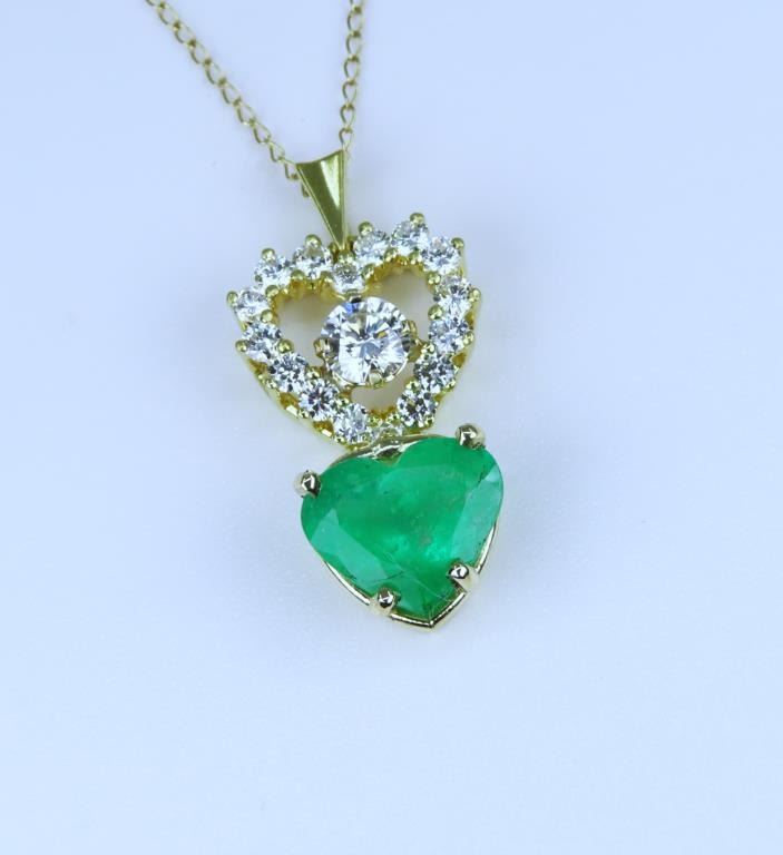 Pendant featuring a 2.55 carat Emerald with rich vivid green color accented with 17 round ‘IDEAL cut’ Diamonds weighing approx. 1.00 carats with G-H colors and extra fine VVS/VS clarity set in an 18 karat yellow gold custom made setting. Retail $6,000-$8,000