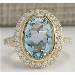 6.35CTW Natural Aquamarine And Diamond Ring In 14K Solid Yellow Gold