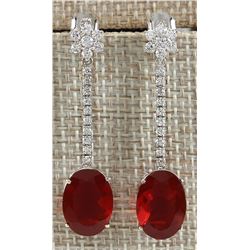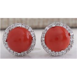 5.89CTW Natural Red Coral And Diamond Earrings 14K Solid White Gold