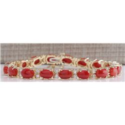 18.44CTW Natural Red Coral And Diamond Bracelet In 14K Solid Yellow Gold