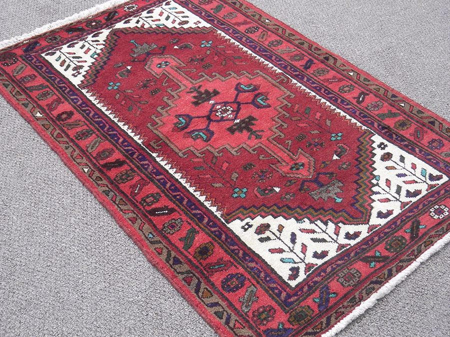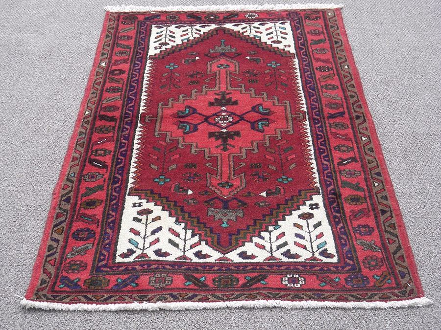Beautiful Fine Quality Hand Woven Persian Hamadan. Size 5.0 X 3.4 feet, made of fine quality baby lamb's wool pile on cotton foundation, all natural vegetable dye, incorporating a free flowing floral and geometric-floral patterns on a rich red background; a unique large dual headed multi colored multi layered centerpiece medallion, crowned corners and an intricately detailed floral-geometric multi layered border. Great contrast in the variety of colors. Hand woven in Hamadan, Iran.