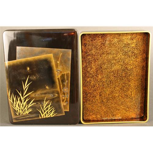 19th Century Meiji Period Japanese Black Lacquered Box with River, Bamboo, Flowers, and Fireflies. A gem of high quality with gorgeous fine details. 9.25 x 6.75 x 1.5 inches, 23.5 x 17 x 4 cm. Excellent Condition.
