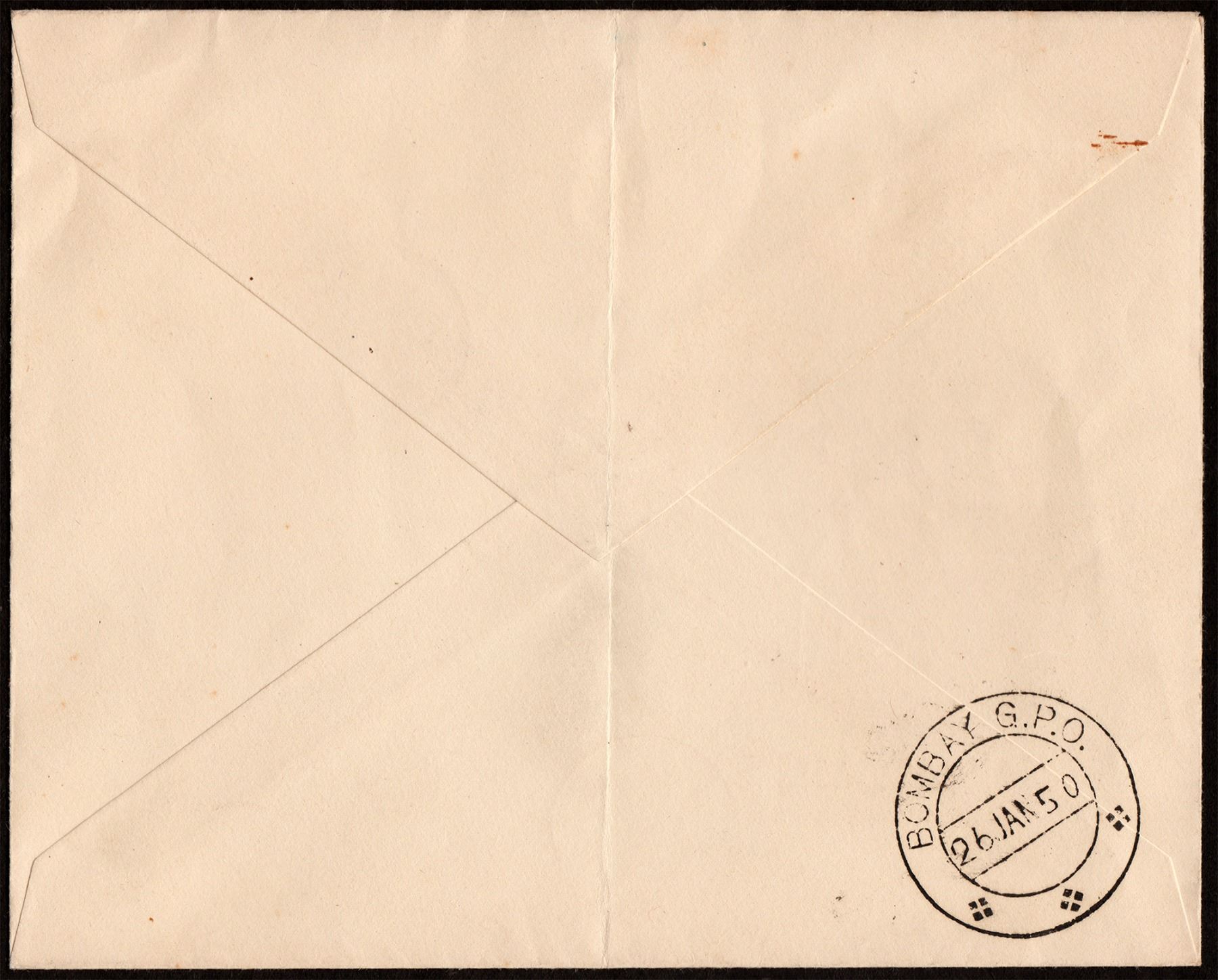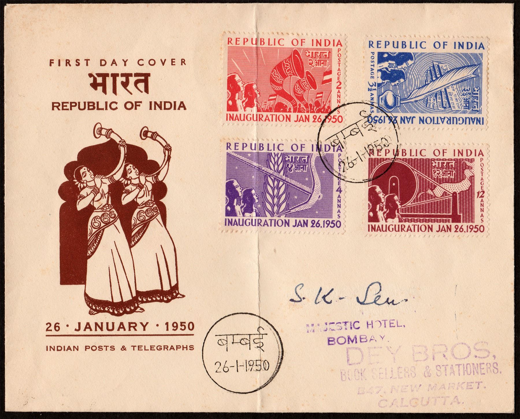 Autographed First Day Cover, 1950, autograph of the first Chief Election Commissioner of Republic India “Mr. Sukumar Sen”, complete set of 2 Annas, 3 ½ Annas, 4 Annas & 12 Annas stamps affixed and cancelled with round seal as “बम्बई | 26-1-1950”, there is a very charming pictorial depiction of 2 traditionally dressed women playing “Sringa” with text as “FIRST DAY COVER | भारत | REPUBLIC OF INDIA | 26 JANUARY 1950 | INDIAN POSTS & TELEGRAPHS”, dispatched by “MAJESTIC HOTEL, | BOMBAY” to “DEY BROS, | BOOK SELLERS & STATIONERS, | B47, NEW MARKET | CALCUTTA”, the delivery seal at the back side of the cover is as “BOMBAY G.P.O. | 26 JAN 50”, good condition, Rare.