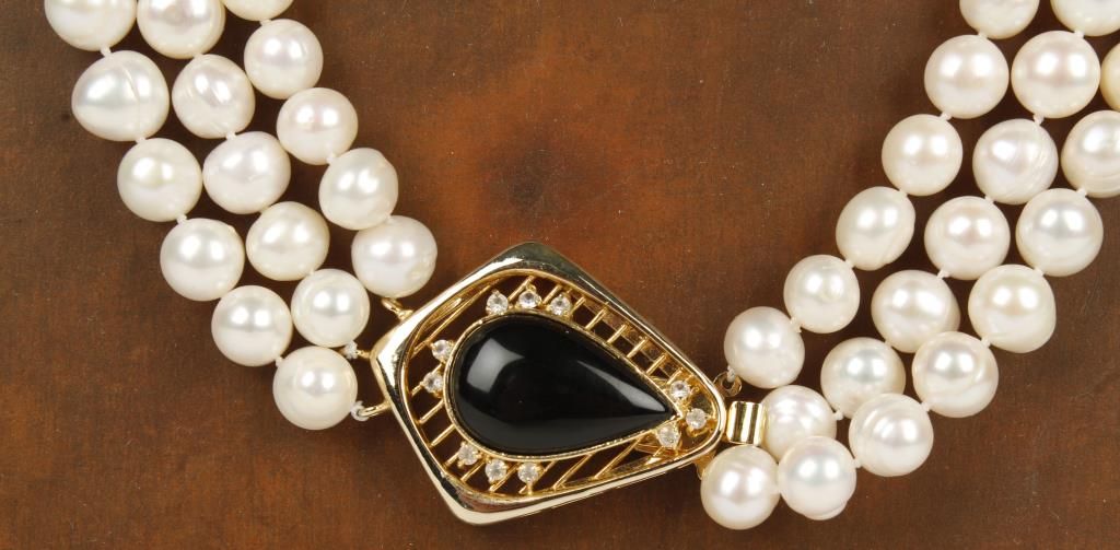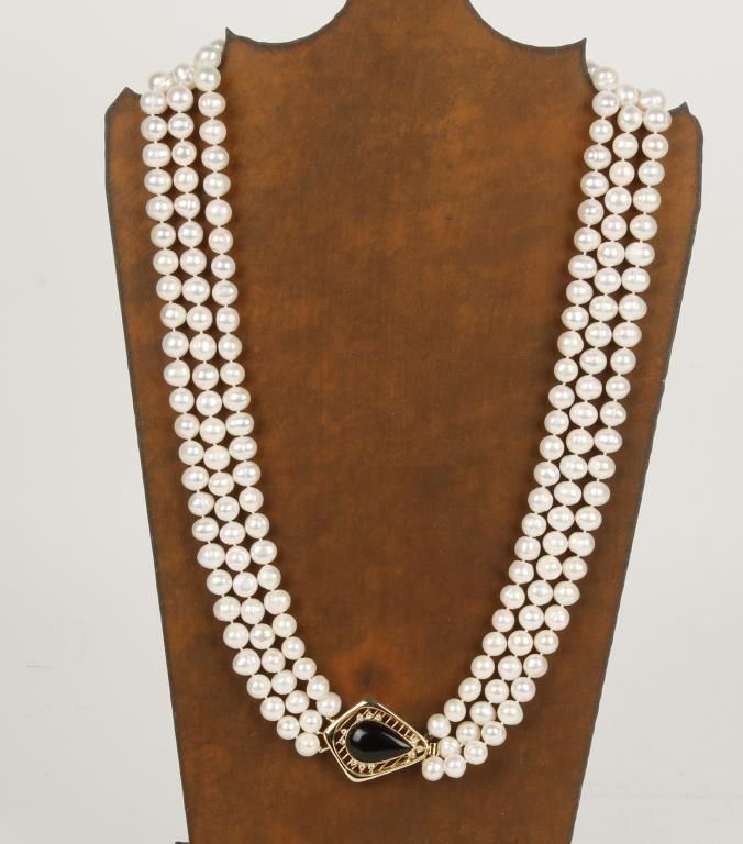 Black and gold clasp, 3 strands of pearls with a pinkish hue, all matching, very high quality.