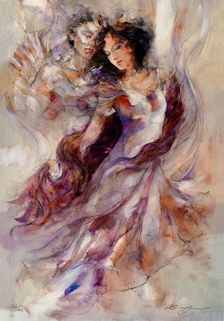 Artist: Gary Benfield - Title: Purple Shawl - Medium: Fine Art Giclee on Canvas - Signature: Hand-signed by the Artist - Limited Edition: 195 - Image Size: Approximately 25.75 inches x 18 inches - Framed: Unframed on UnStretched Canvas - Details: This work comes with a Certificate of Authenticity - Biography: Benfield's paintings are drawn rapidly with an almost passionate urgency. Many sketches are immediately discarded, only those that feel right, that have integrity are presented to the public. This ensures that his work is dynamic yet maintains a strong organic unity. Few artists can, as well as Benfield, capture the sense of movement, both physical and emotional. After leaving the academic world he set up his own studio near London and concentrated on drawing and painting figures. Within a few years his work was collected throughout Europe and his reputation firmly established.