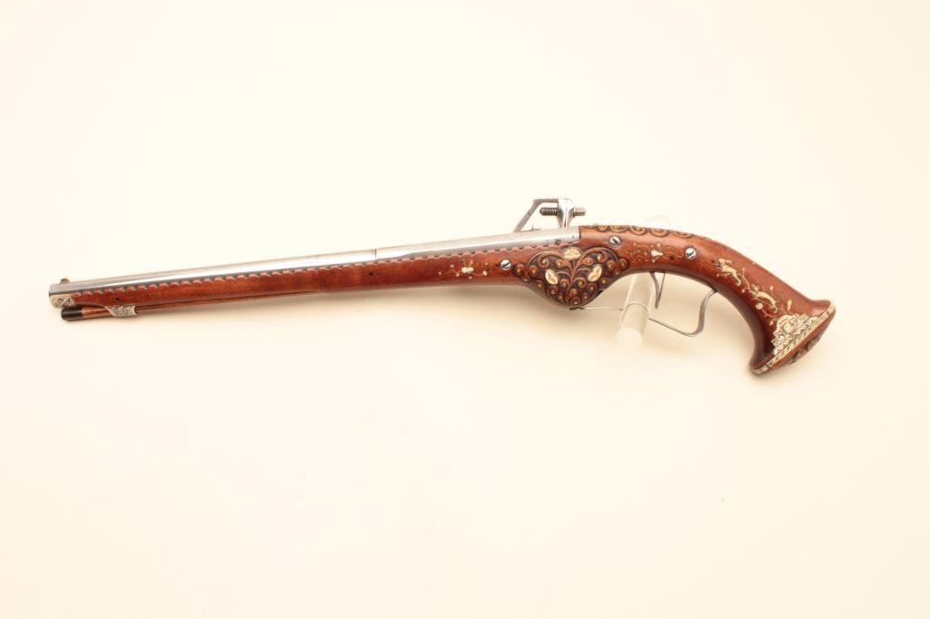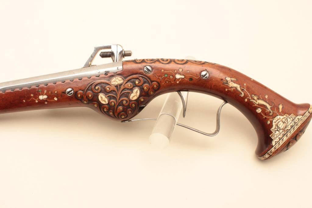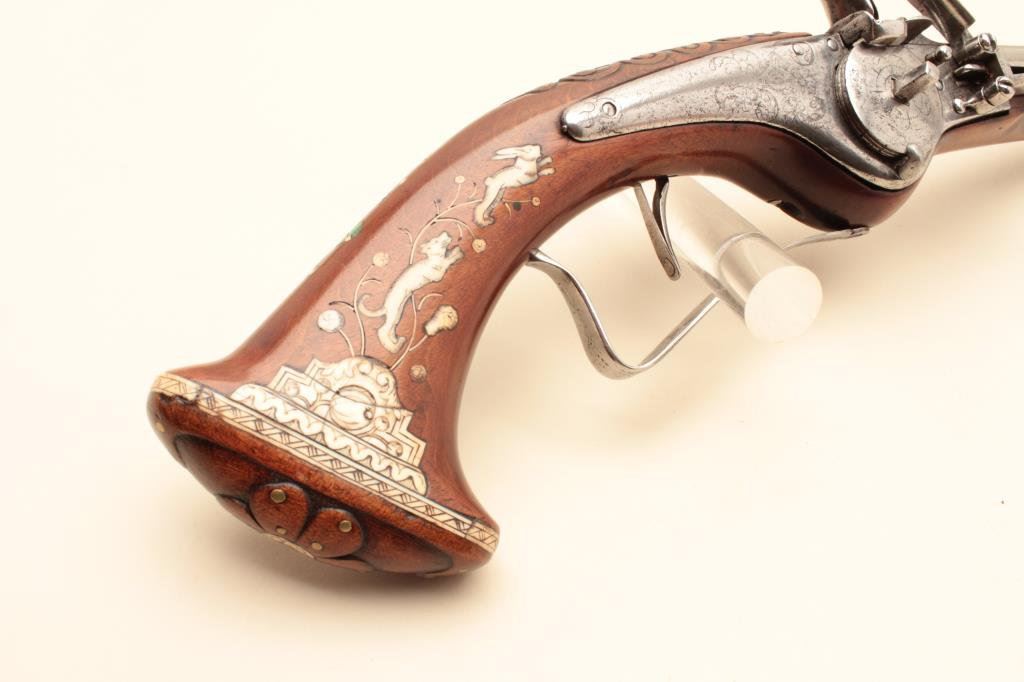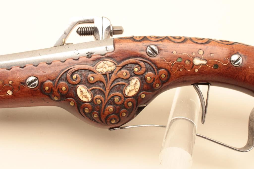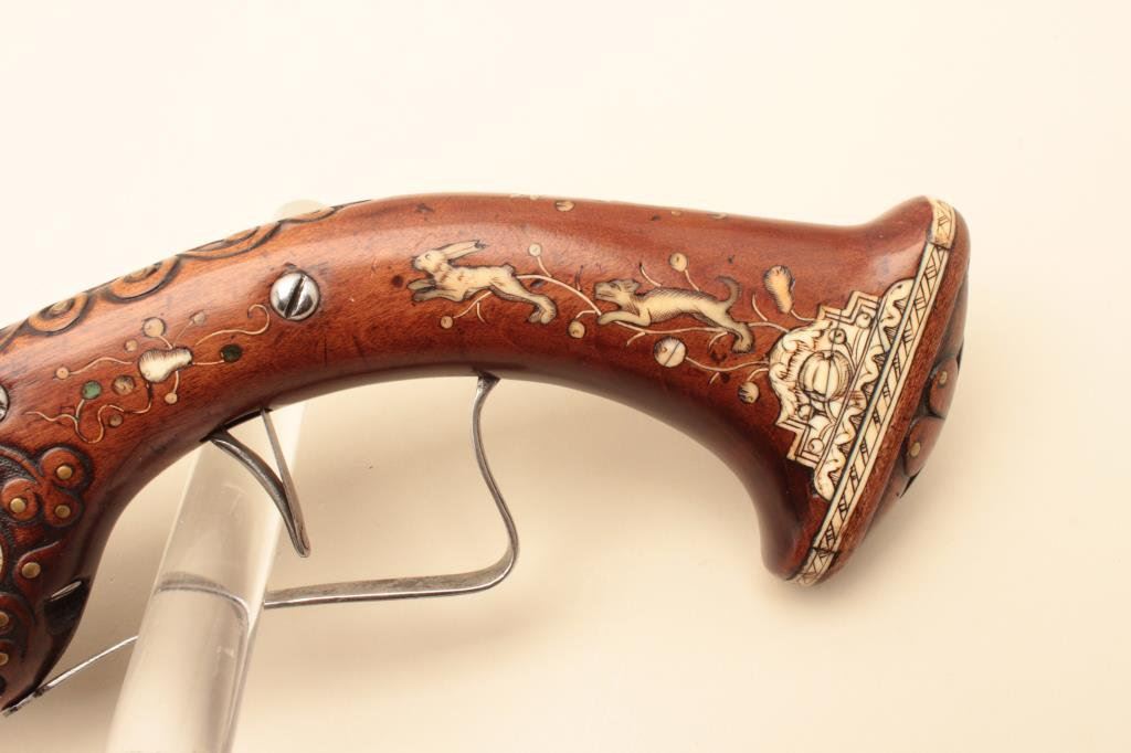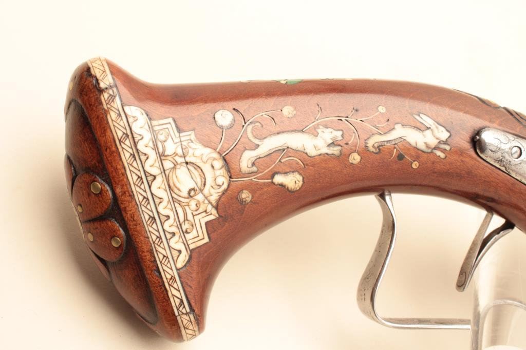 a 14” barrel, engraved lock mechanism, wood stock with scalloping along both sides of the fore stock area, carving and brass piercings at the top of the wrist followed by nicely accomplished bone inlays of dogs chasing rabbits, vines and florals, etc.; brass tipped wood ramrod with decorated bone forend cap and ramrod retainer. (Antique). Est.: $4,000-$8,000.