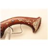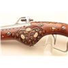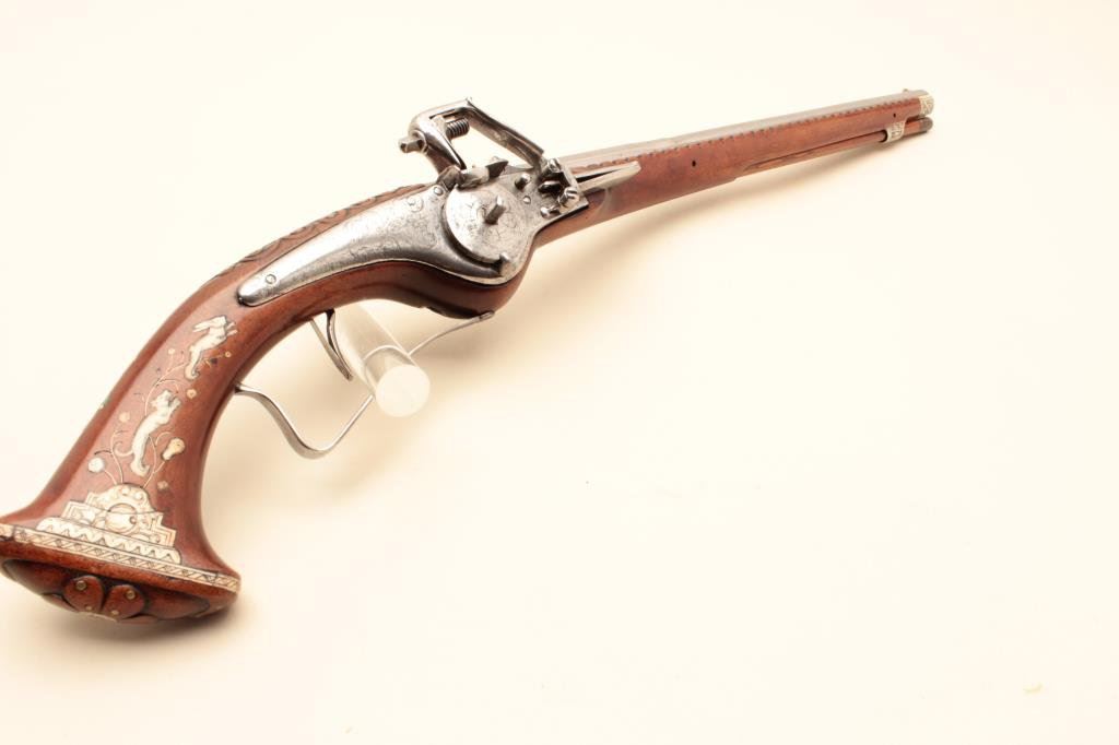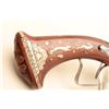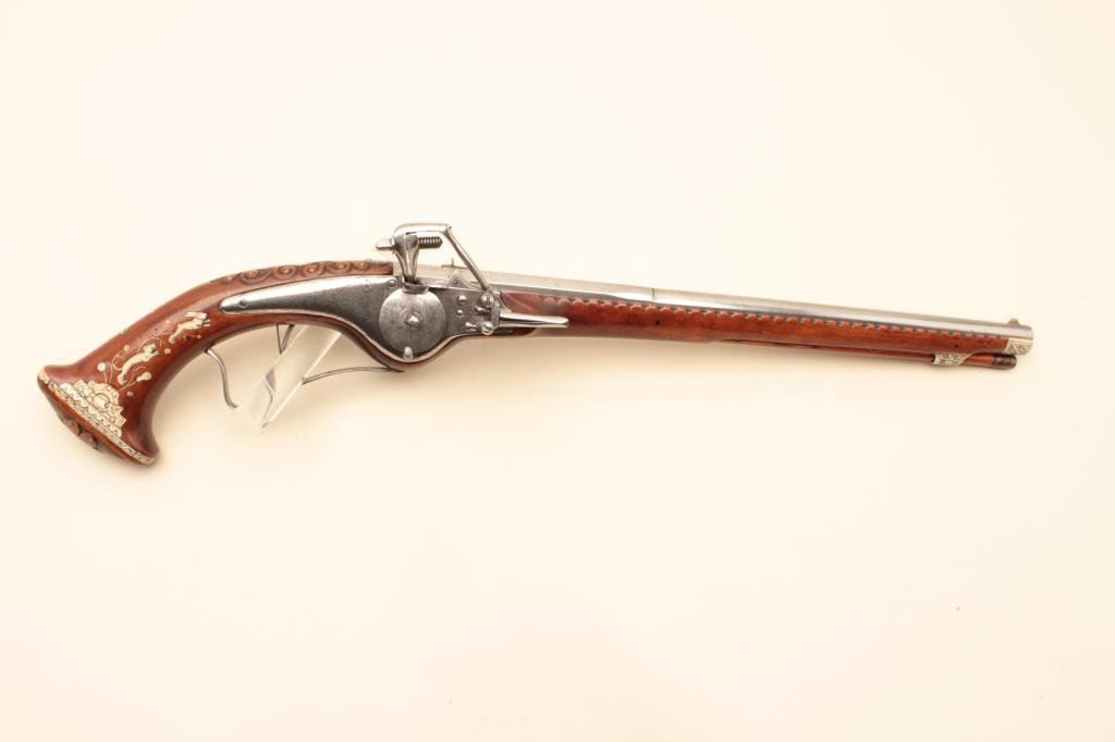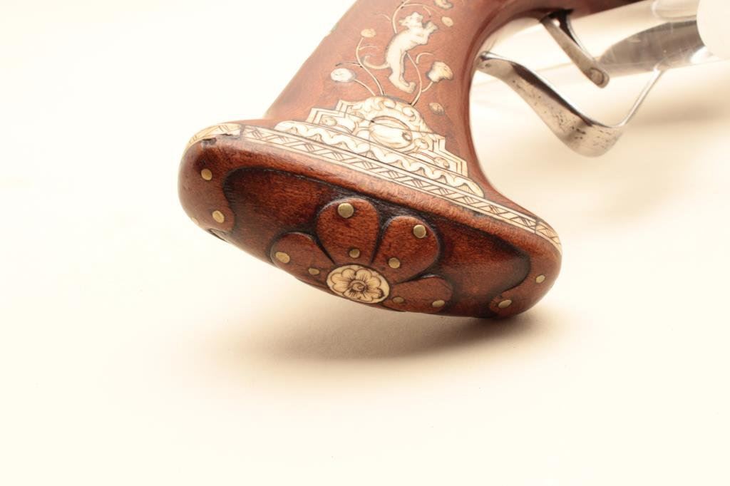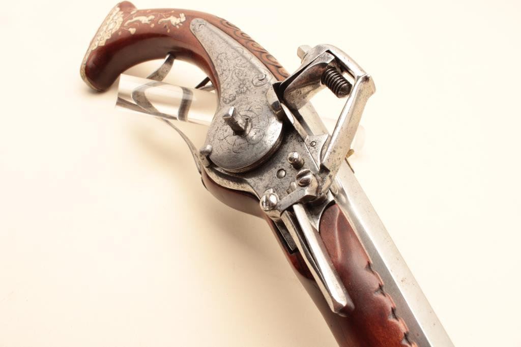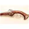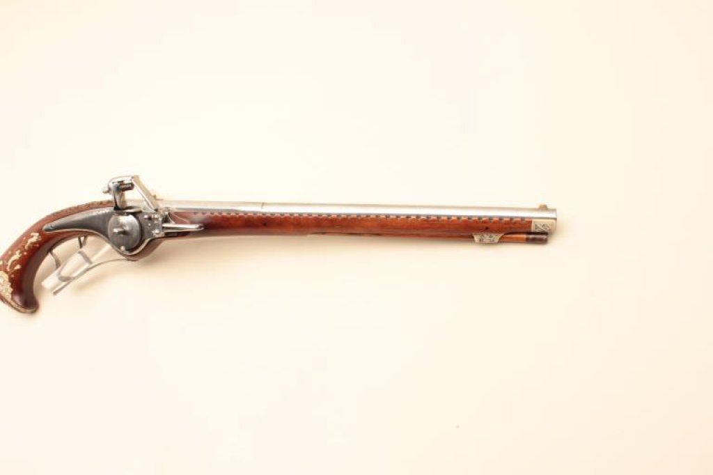 a 14” barrel, engraved lock mechanism, wood stock with scalloping along both sides of the fore stock area, carving and brass piercings at the top of the wrist followed by nicely accomplished bone inlays of dogs chasing rabbits, vines and florals, etc.; brass tipped wood ramrod with decorated bone forend cap and ramrod retainer. (Antique). Est.: $4,000-$8,000.