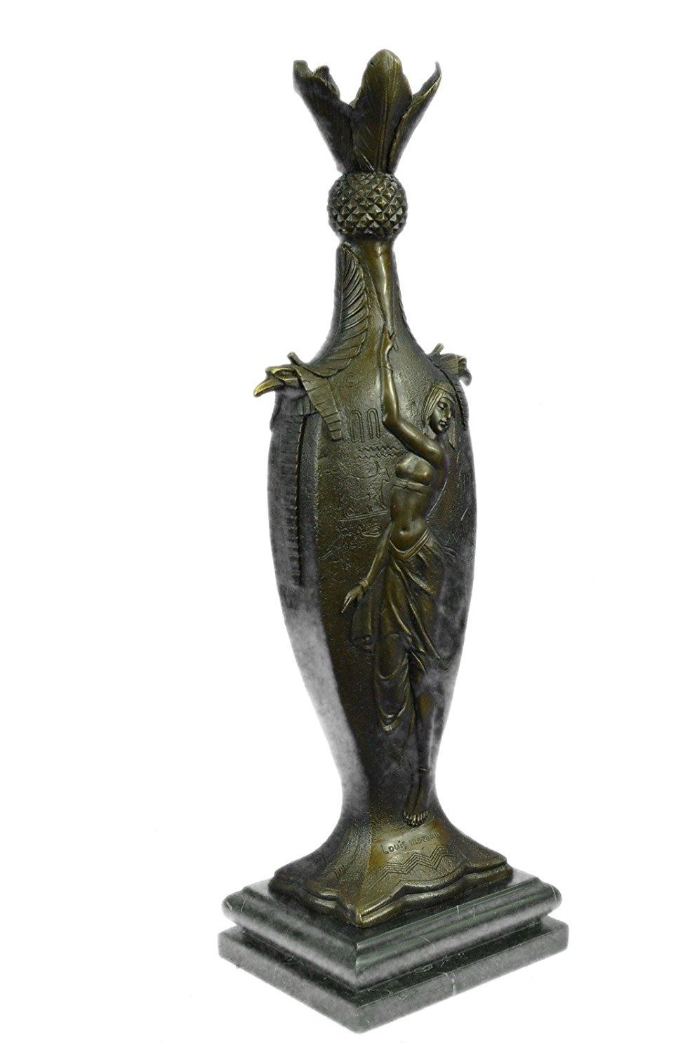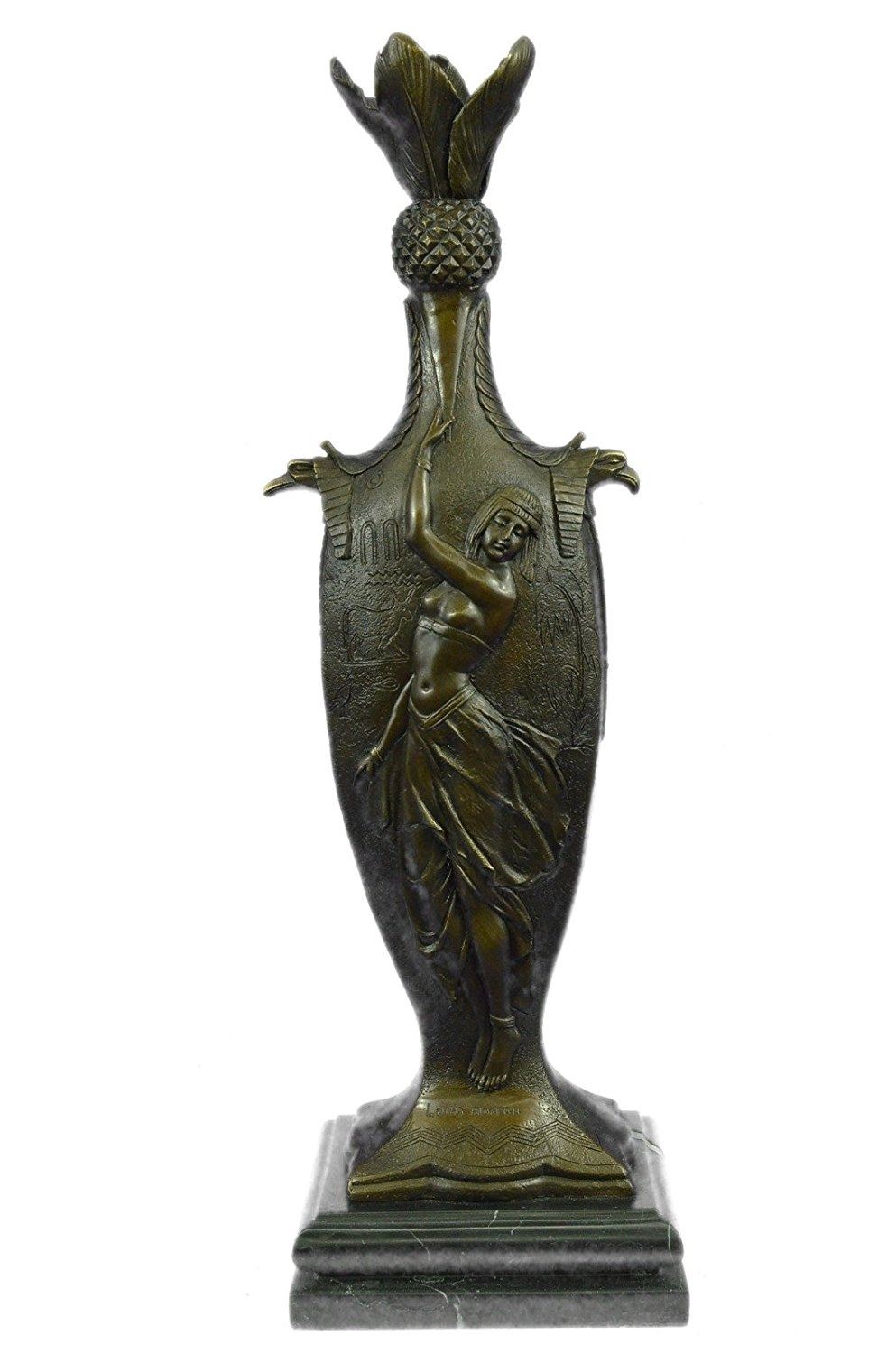 This unique sculpture is reminiscent of the hieroglyphics you would have found along the walls of ancient Egypt. A young woman dances and behind her are the ancient scripts of old Egypt. The beauty in this sculpture are in the fine detailing of Egyptian symbols. 100% bronze and handmade, this brown patina sculpture was cast using the Lost Wax Method and mounted on a marble base. Bronze Dimensions with Marble Base: Height 18 X Width 5 inches. Weight: 12 LBS. Inventory: 12B6704721