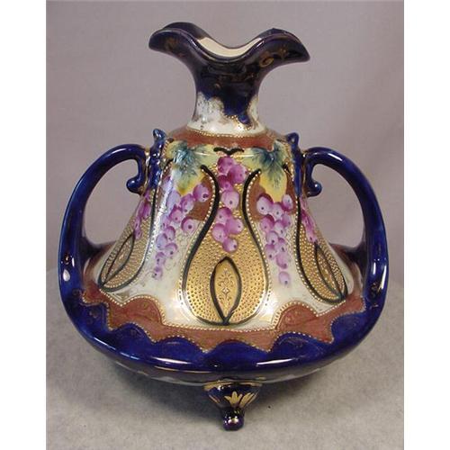Beautiful hand painted with raised gold decoration old porcelain handled vase. It has a very unusual shape and design. The condition is excellent. There is no signature on the vase to identify it. The quality, composition and design speak for itself. This is a beautiful piece measuring 7 inches high, 7 inches wide from handle to handle, diameter 6-1/2 inches.