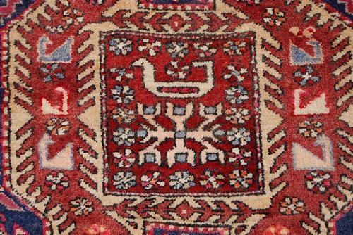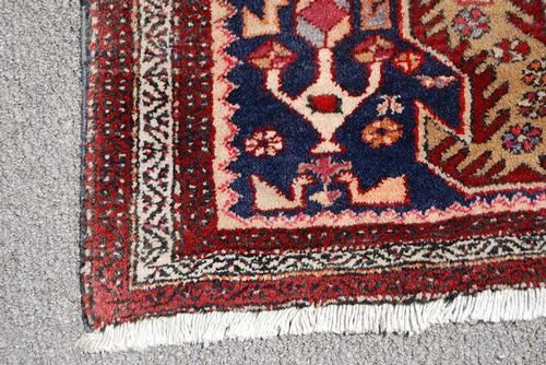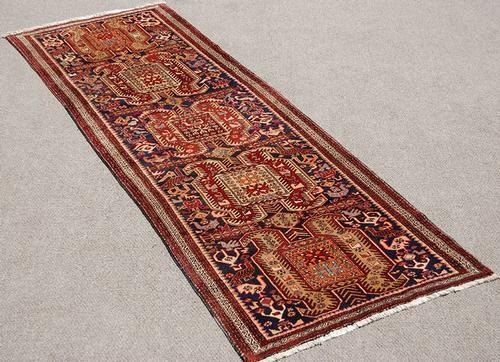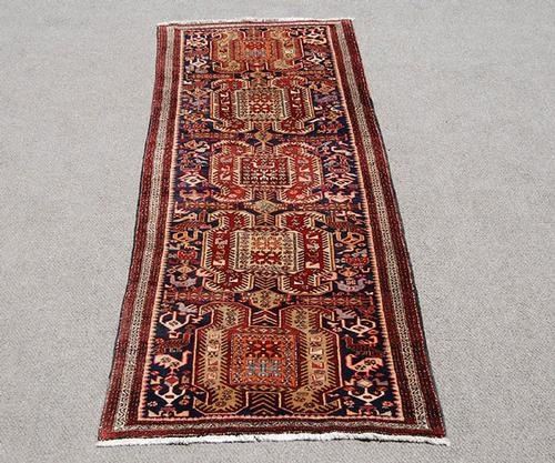 Beautiful hand woven semi antique Persian Meshgin. Made of fine quality baby lamb's wool pile on cotton foundation. All natural vegetable dye, the weaver utilized a very rare and unique looking design, incorporates allover geometric motifs pattern on a navy blue background with a row of five large medallions, contrasted beautifully with a light and red toned intricate done floral multi layered border. Hand woven in City of Meshgin from Iran. Size: 3 feet 5 inches X 10 feet 3 inches.