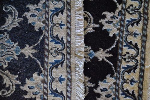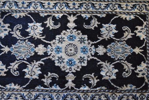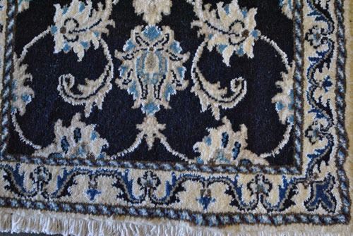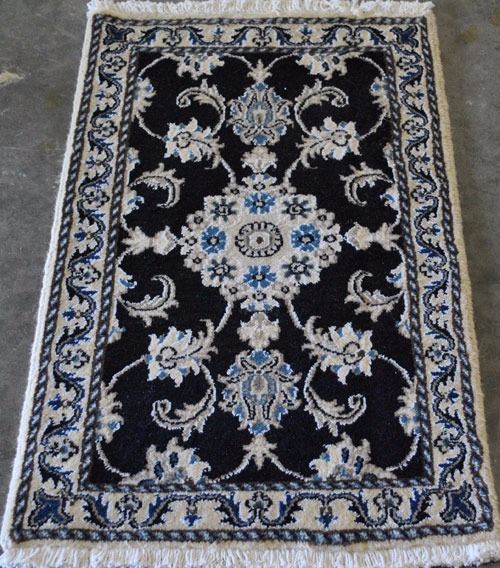 100% baby lamb's wool part silk on cotton foundation. Hand-made vegetable dye rug from city of Nain. Size 2.11 x 1.9 ft
