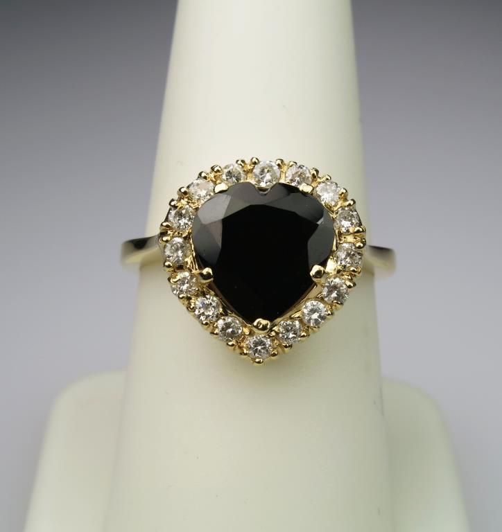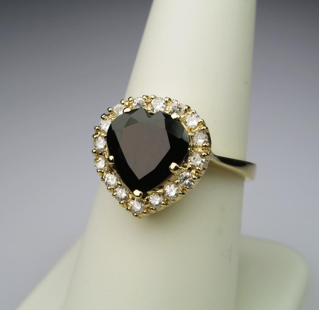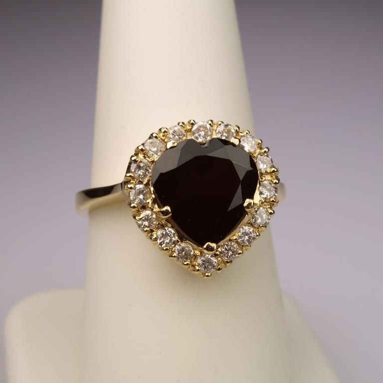 Beautiful Heart shaped Rhodolite Garnet and Diamond Ring with approx. 5.00 carat garnet and 16 round cut Diamonds weighing approx. 0.80 carats with G-H colors and SI clarity set in 14 karat yellow gold. Retail $1,600-$2,000 Estimate$800-$1,200 Nice