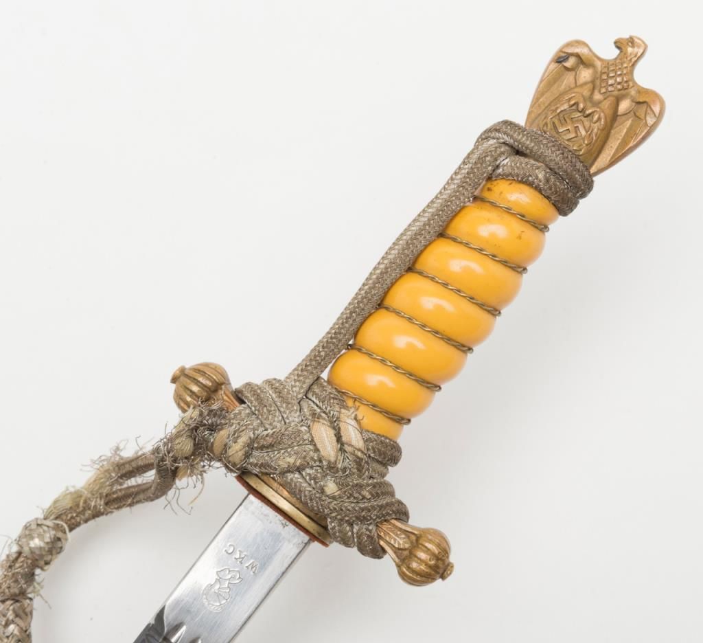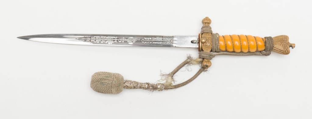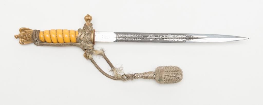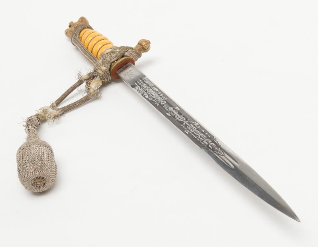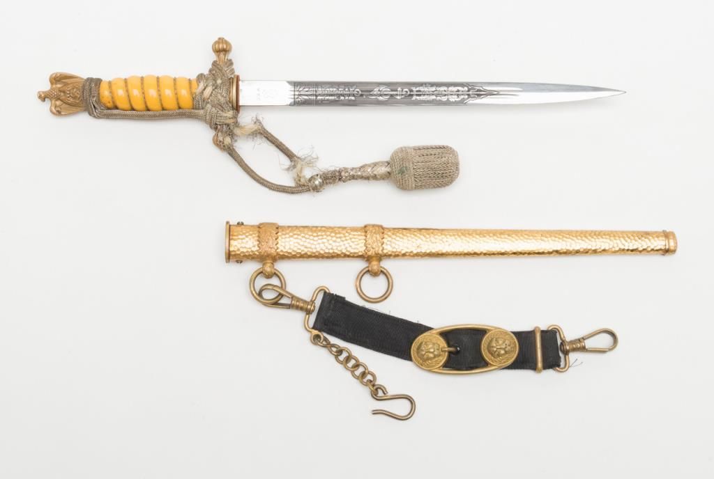 Beautiful High Grade nazi Naval Officer’s Dress dagger with pebble grain scabbard, hanger and sword knot in overall fine condition with a beautifully etched blade marked “WKC” under a knight’s helmet; hanger shows lion heads; wirewrapped grip, eagle pommel. Est.: $900-$1,800.