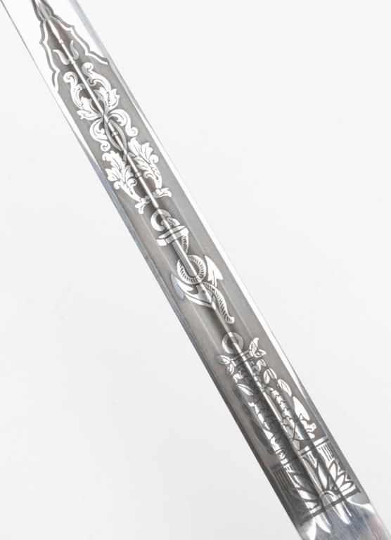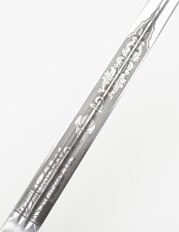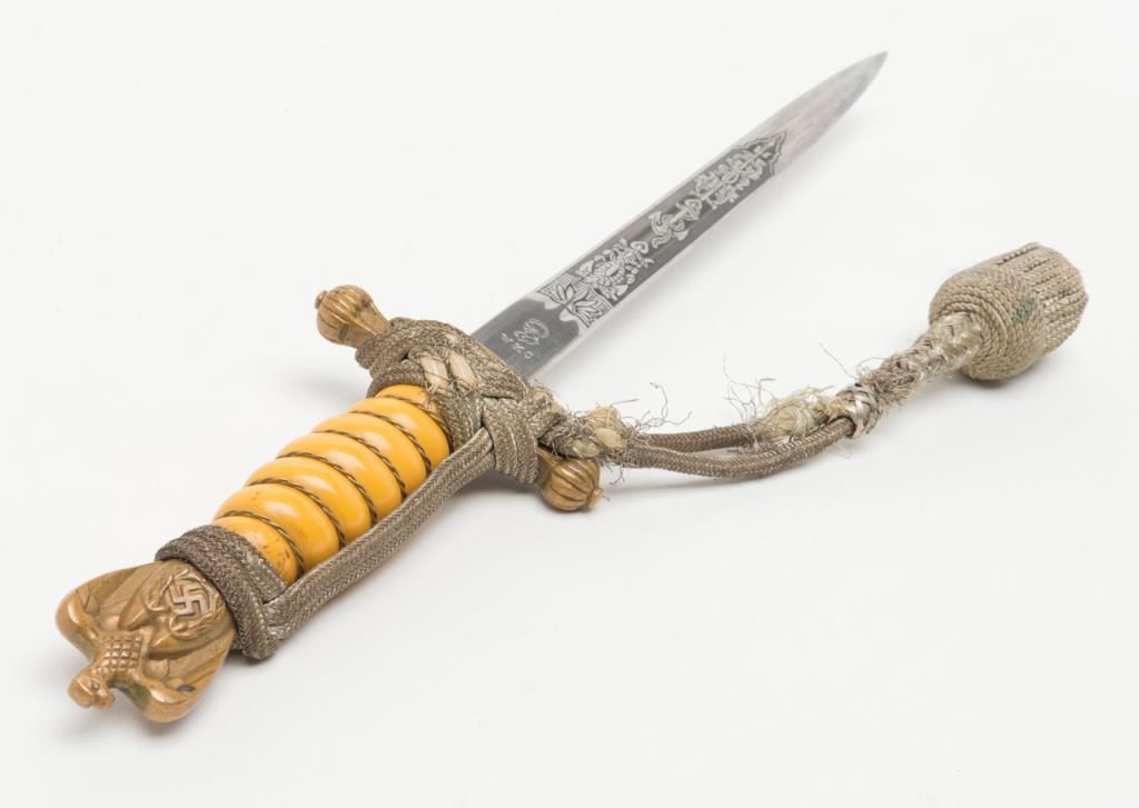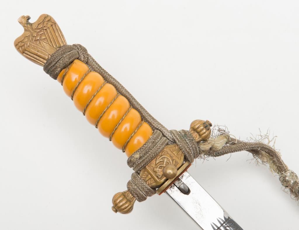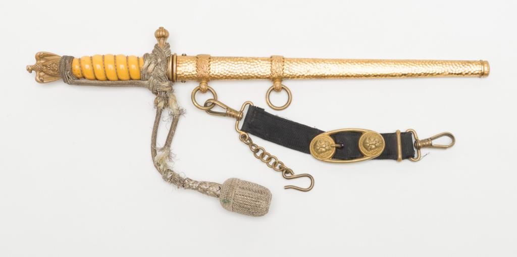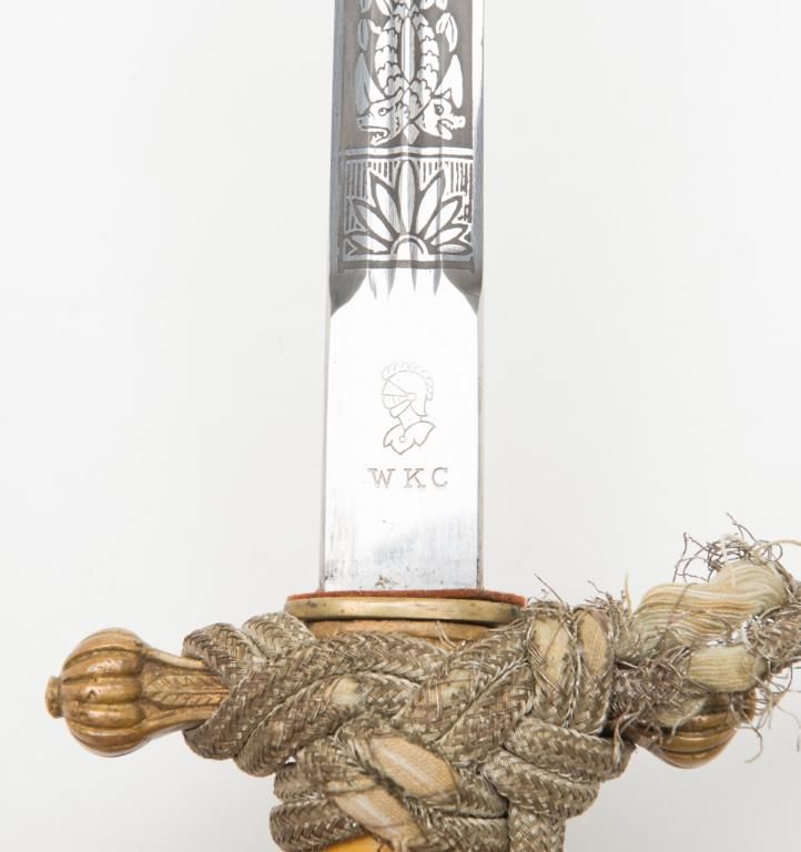 Beautiful High Grade nazi Naval Officer’s Dress dagger with pebble grain scabbard, hanger and sword knot in overall fine condition with a beautifully etched blade marked “WKC” under a knight’s helmet; hanger shows lion heads; wirewrapped grip, eagle pommel. Est.: $900-$1,800.
