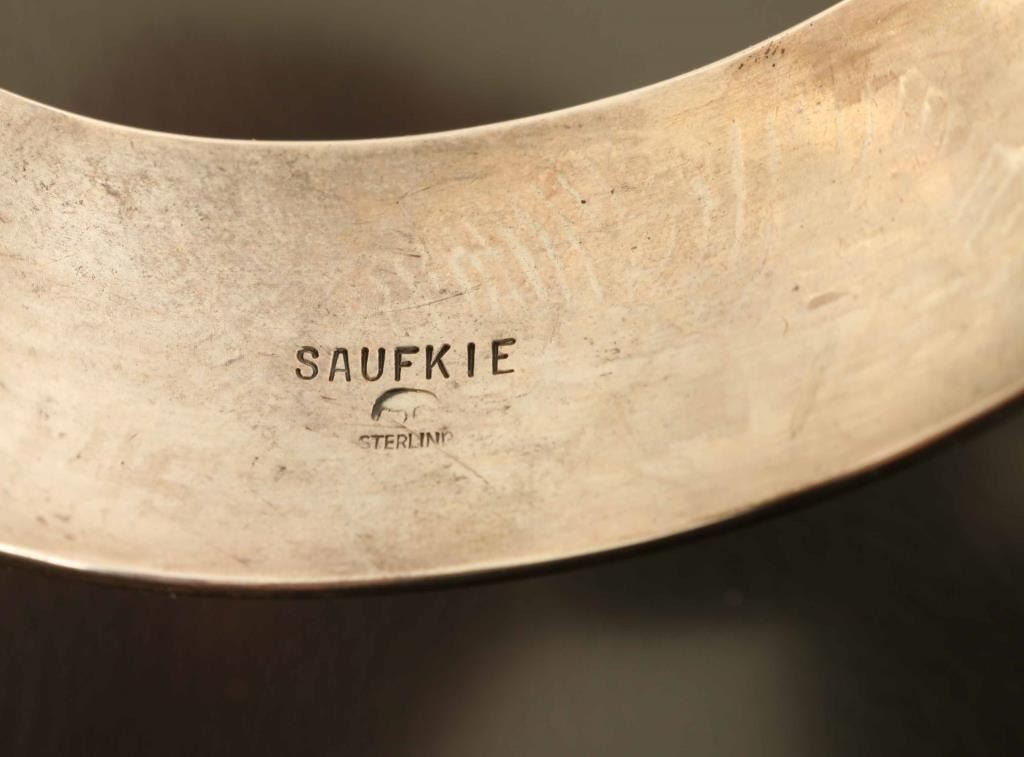 Bear design surrounded by geometric designs. Made by the famous silversmith Lawrence Saufkie maker marked with bear. From the Spike Flanders collection Silver City New Mexico. 1"wide by 8" with gap. Bio-Lawrence Saufkie was born in 1935 and passed in 2011. He was taught by his father Paul and by Fred Kaboti who originated the Hopi style of silversmithing in the 1930s. A member of the bear clan, he was a pioneering silversmith for over 60 years. He won the SWAIA lifetime achievement award and was named an Arizona living treasure in his later years. He is collected by many well known museums and received an award from the American Museum of Natural History