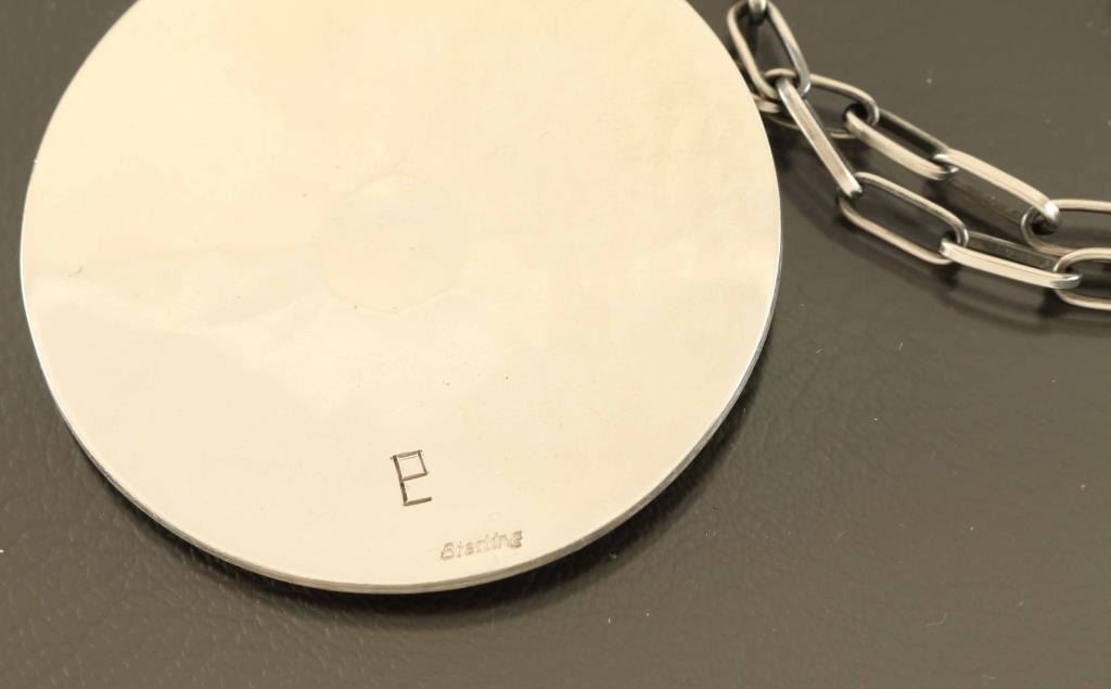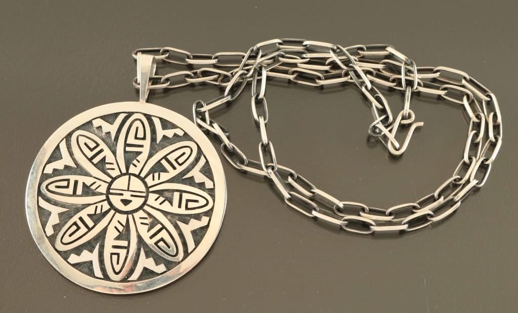 has a Kachina within a daisy design all sterling marked "PL" on handmade chain.