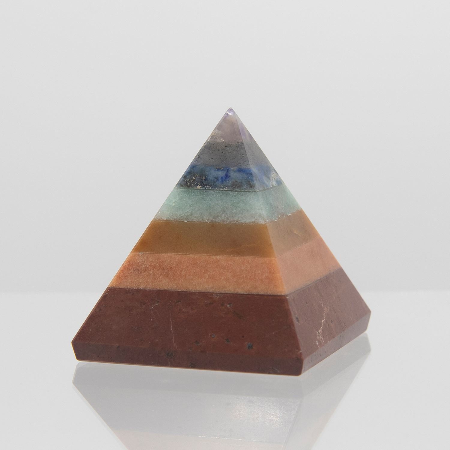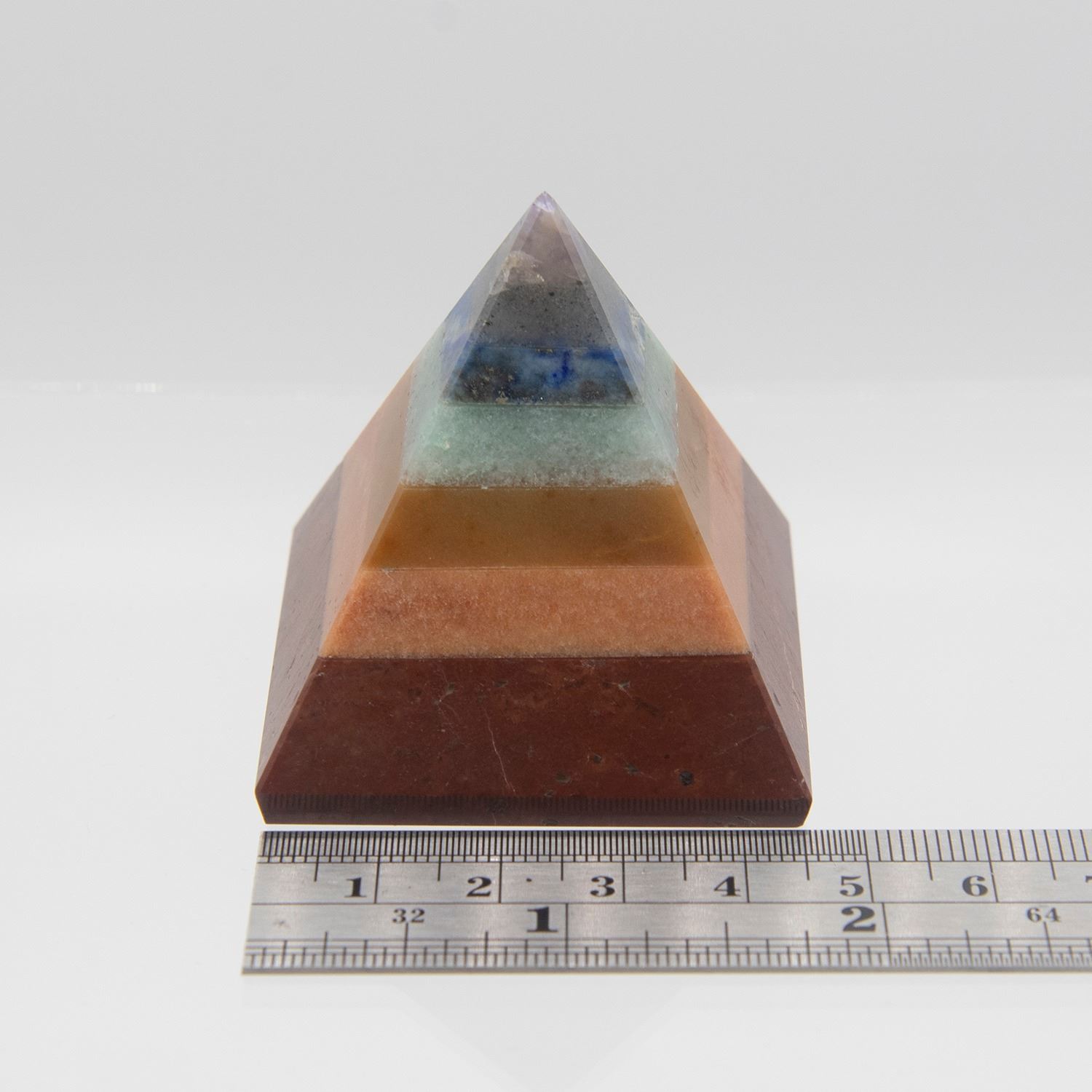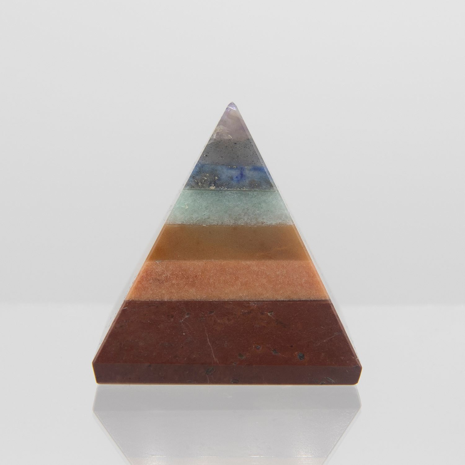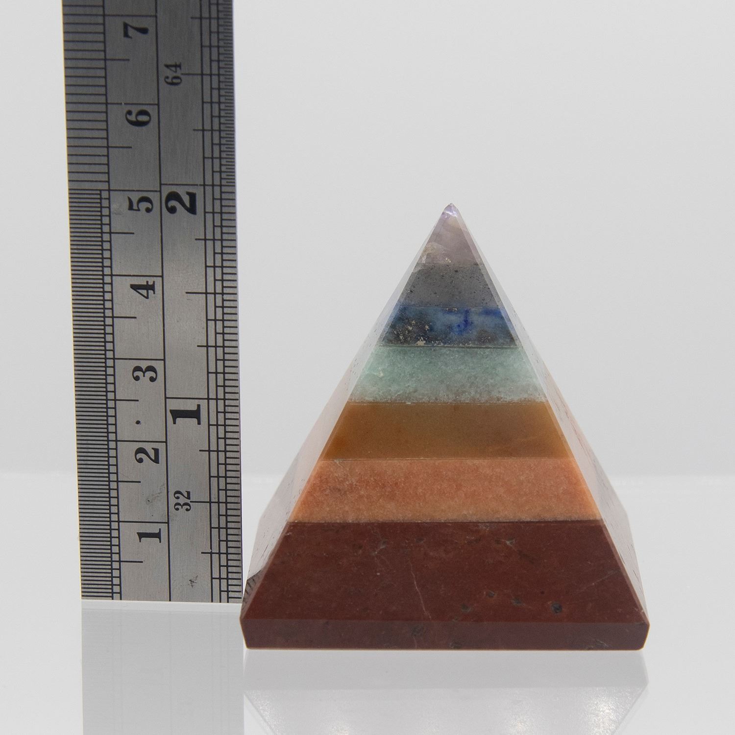 This all-natural gemstone pyramid base is 45 x 45mm and stands 50mm high. The gems used are a set of 7: Amethyst, Carnelian, Yellow Jade, Green Aventurine, Lapis Lazuli, Clear Crystal, and Red Jasper.