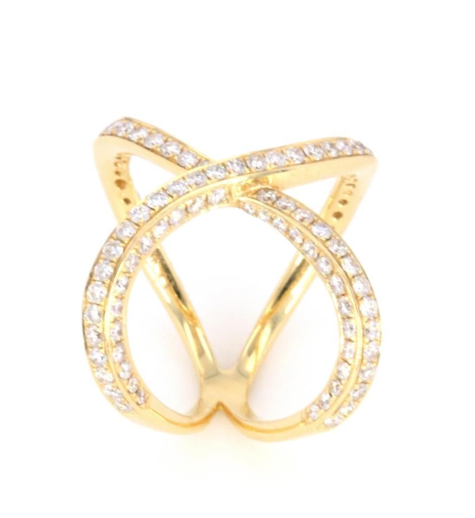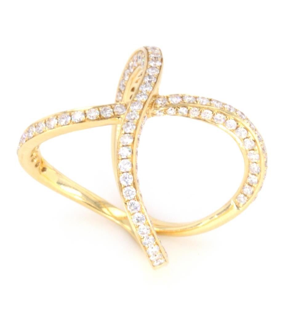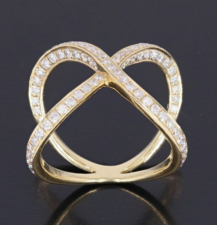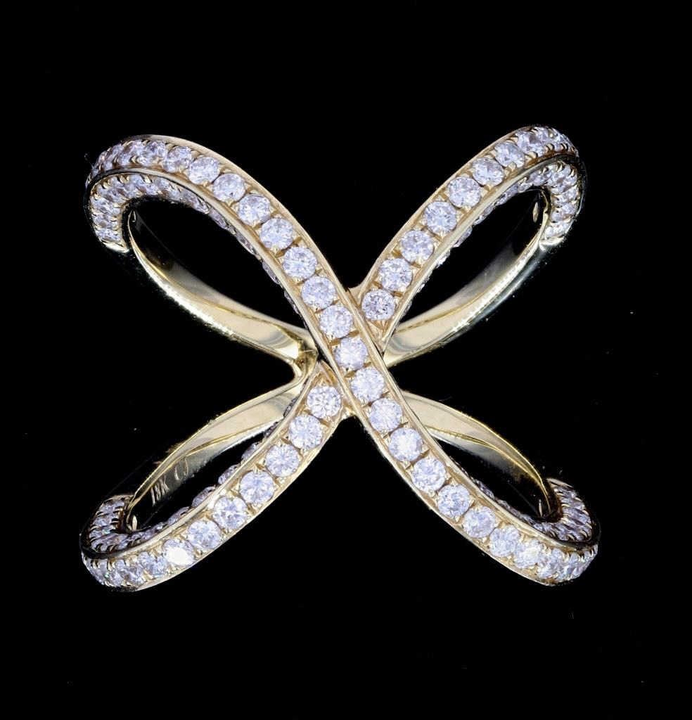This is an excellent designer jewelry piece showing a truly beautiful infinity 18K gold design set with 3.87 carats of Diamonds. The rings shows two overlapping bands in an infinity wide design set with diamonds along the entire top of the band along with being set with diamonds on the inside edge of the band, a truly artistic finish. The piece overall is set with 113 round brilliant cut diamonds with a weight of 3.87 carats in an 18 karat yellow gold band that shows 5.47 grams of gold. Ring has a size of 7 US.