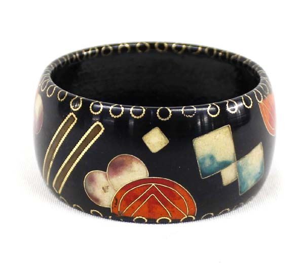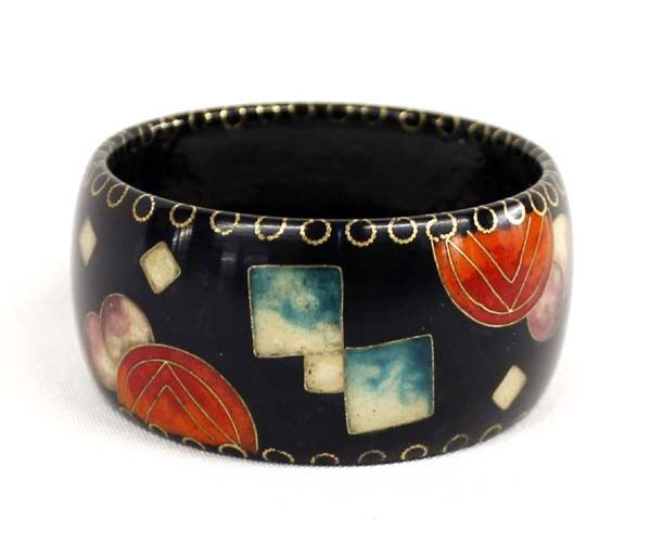 Beautiful Vintage Inlay Brass Cloisonne' and Enamel Bangle Bracelet, Geometric and Abstract designs, circumference measures 9'', gorgeous colors