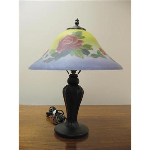 Beautiful art deco style lamp with a frosted glass shade.Shade is painted on the inside showing red roses against a blue and yellow background. It is 19" height and 15" width. Lamp is painted a dark brown and has gorgeous lines enhancing it's design. Wonderful piece for any room.
