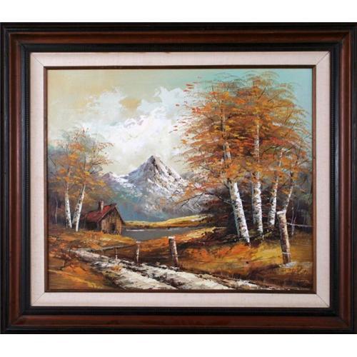 This is a skillfully rendered original oil painting that exhibits all the mastery of technique and control of brushwork of its artist. The placement of the brilliantly warm, orange leaves against the cool blue sky allows the painting to vibrate with the colors of autumn. Careful placement of the tonal contrast allows the center of interest to grab the viewer?s attention. The meticulously rendered texture of this painting brings the painting to life. This painting is elegantly framed in a dark stained wood frame with a fabric lining making the entire picture measure 26.75? x 30.75?.
