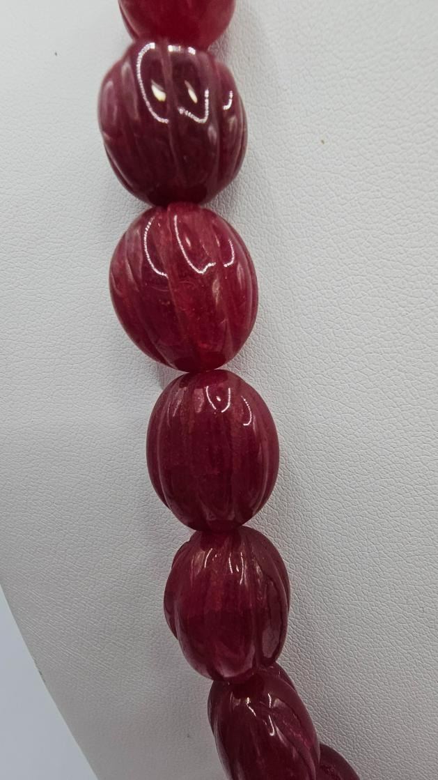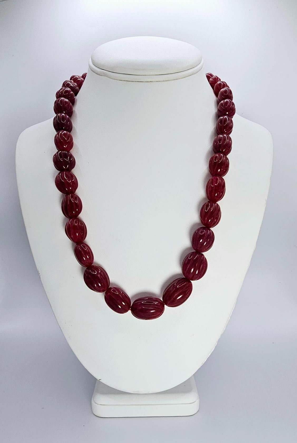 Stunning Large 566.50 Ctw Mined From The Earth Natural Red Ruby Necklace. This necklace is made with large carved oval pear cut beads that range in size from approx 12 to 18 mm. This necklace is also adjustable to go great with many different looks or outfits. The necklace size ranges from as short as choker size to a full 28 " necklace and everything in between. These natural ruby beads are natural opaque and treated to enhance color. Get ready for all of the compliments on this necklace. It's "Gorgeous"!!!