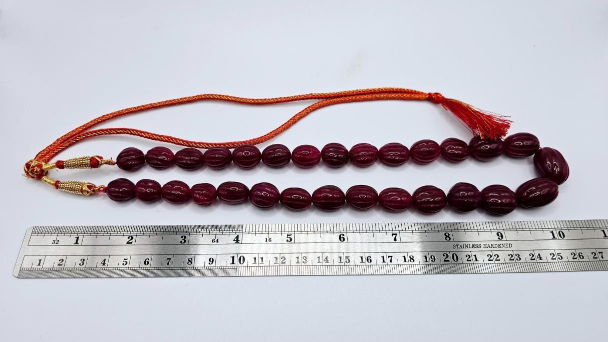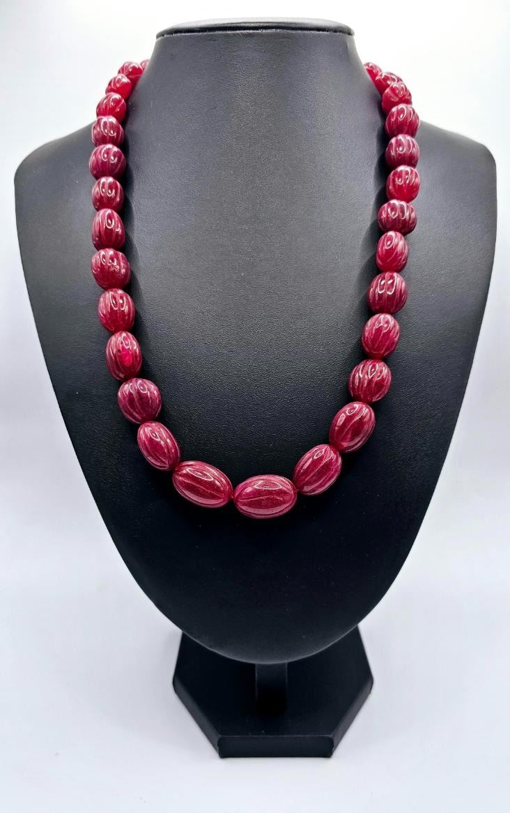 Stunning Large 566.50 Ctw Mined From The Earth Natural Red Ruby Necklace. This necklace is made with large carved oval pear cut beads that range in size from approx 12 to 18 mm. This necklace is also adjustable to go great with many different looks or outfits. The necklace size ranges from as short as choker size to a full 28 " necklace and everything in between. These natural ruby beads are natural opaque and treated to enhance color. Get ready for all of the compliments on this necklace. It's "Gorgeous"!!!