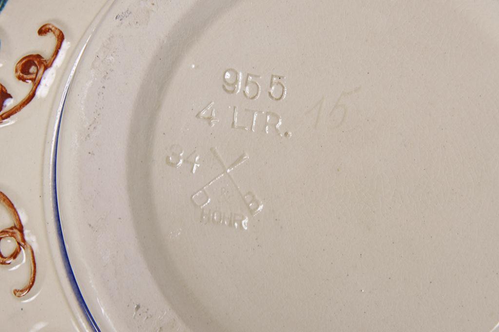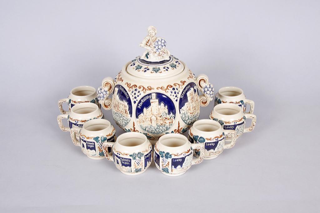 Beautiful Large German Punchbowl Set Includes 7 matching cups, depicting different cities in Germany, stamped "HOHR" 4 liter, in overall excellent condition. Has small chip to hat on punchbowl.Includes 7 matching cups, depicting different cities in Germany, stamped "HOHR" 4 liter, in overall excellent condition. Has small chip to hat on punchbowl.