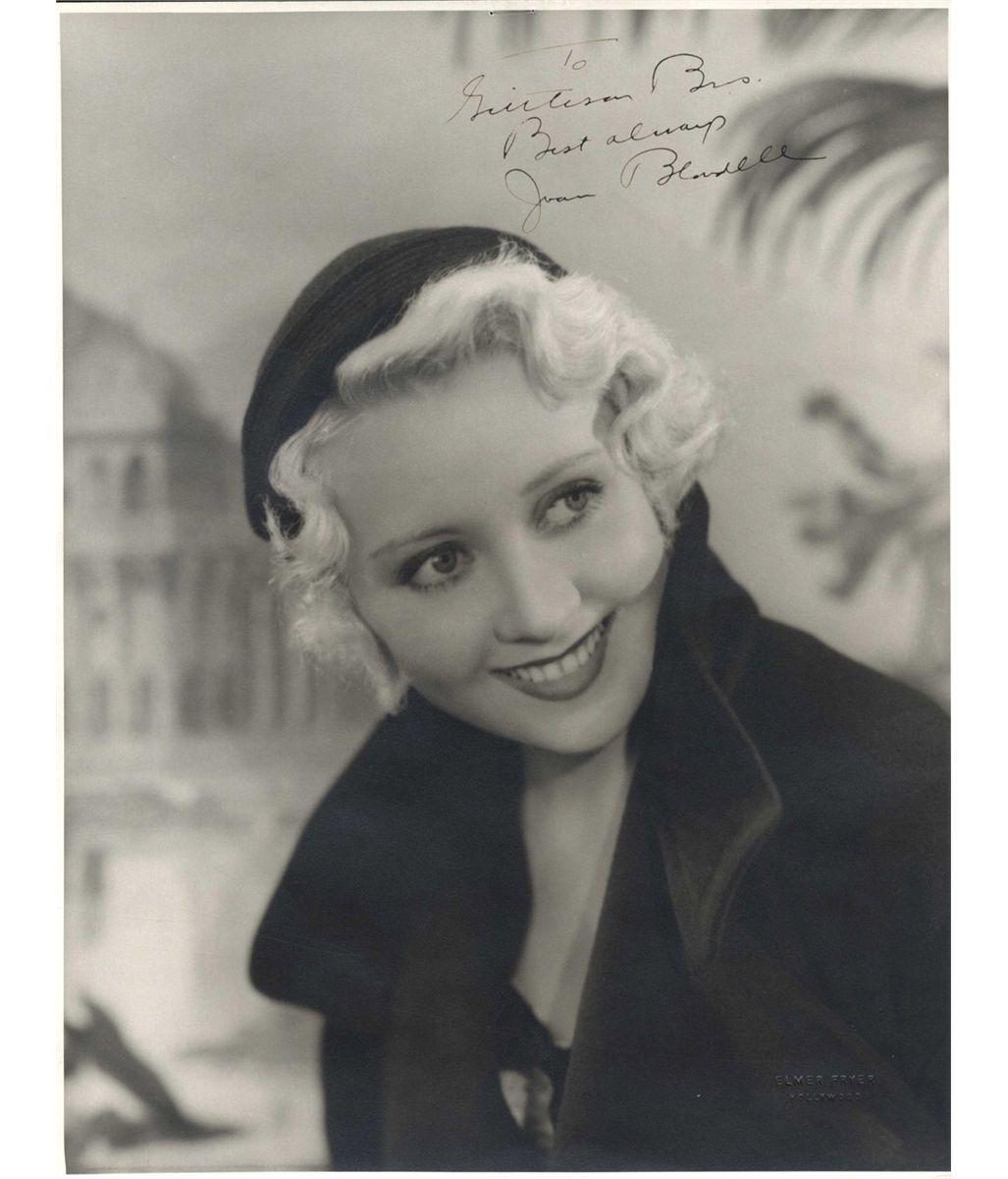 Large matte photograph of Hollywood bombshell Joan Blondell, inscribed and signed clearly by the actress ''Best always Joan Blondell''. Blondell, radiant in this photo, starred in over 100 productions, including ''The Public Enemy'' and ''A Tree Grows in Brooklyn.'' Photo measures 10.5'' x 13.5''. Small staple hold at the top, else fine.