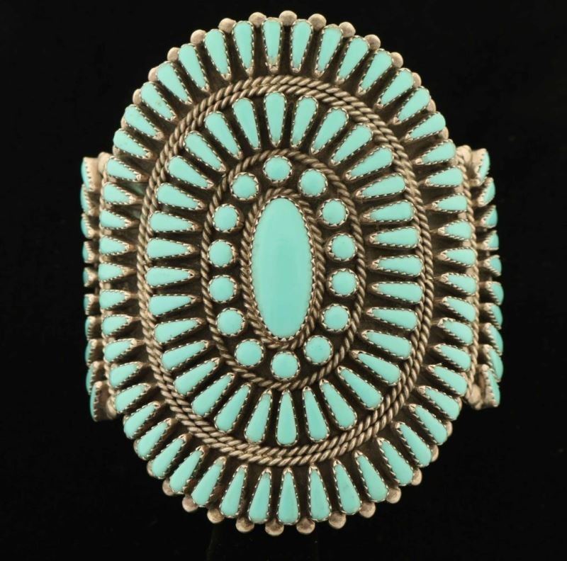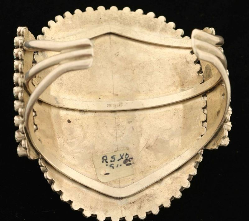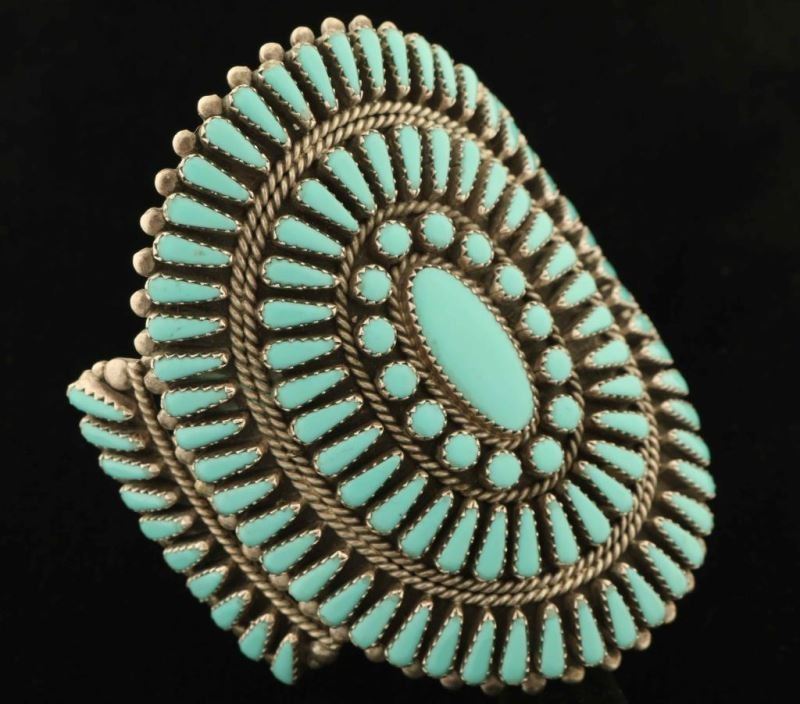 Large 3 1/8" x 4" oval of sterling silver with light blue turquoise cluster pattern and side 'wings' of ten stones on each side. Marked 'Sterling'. Inside of cuff measures 2 3/8".