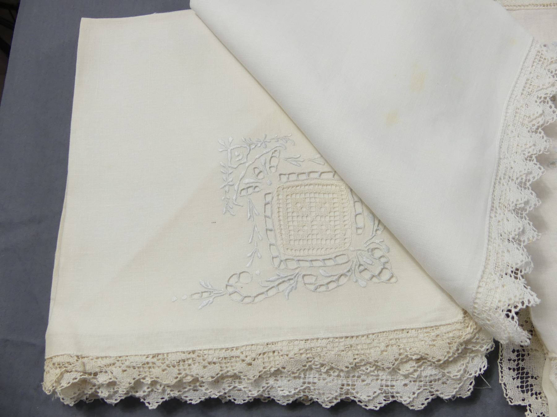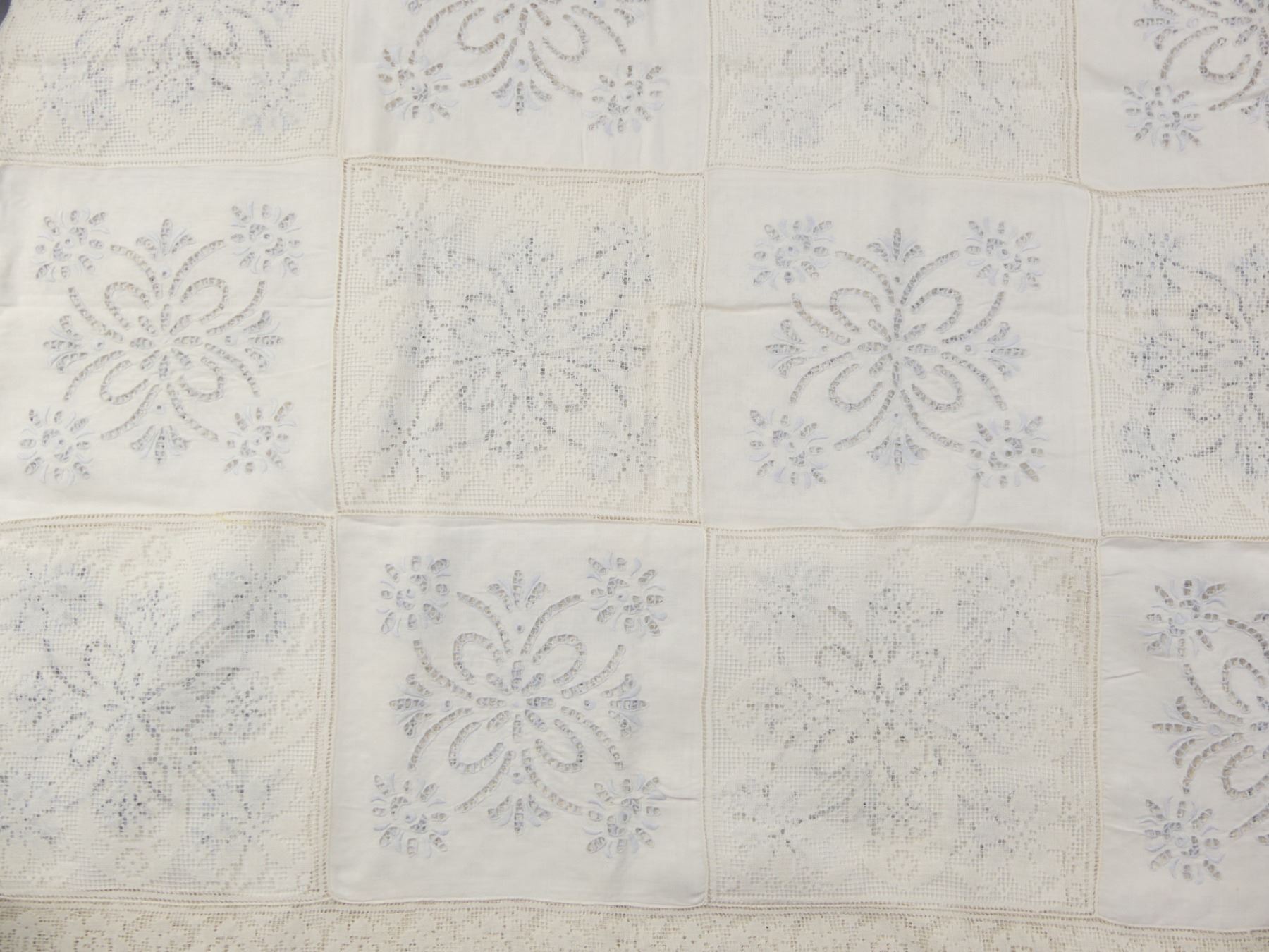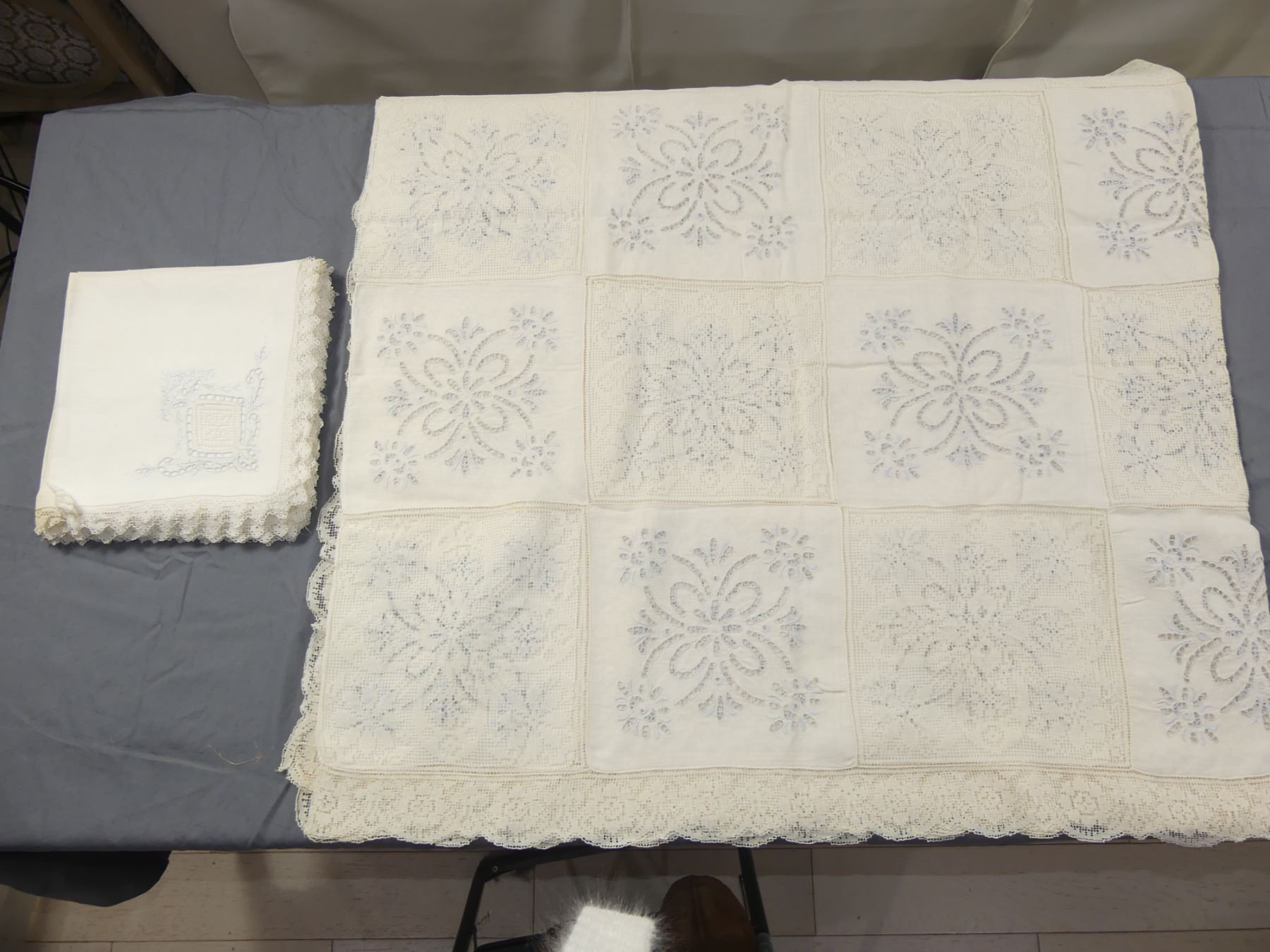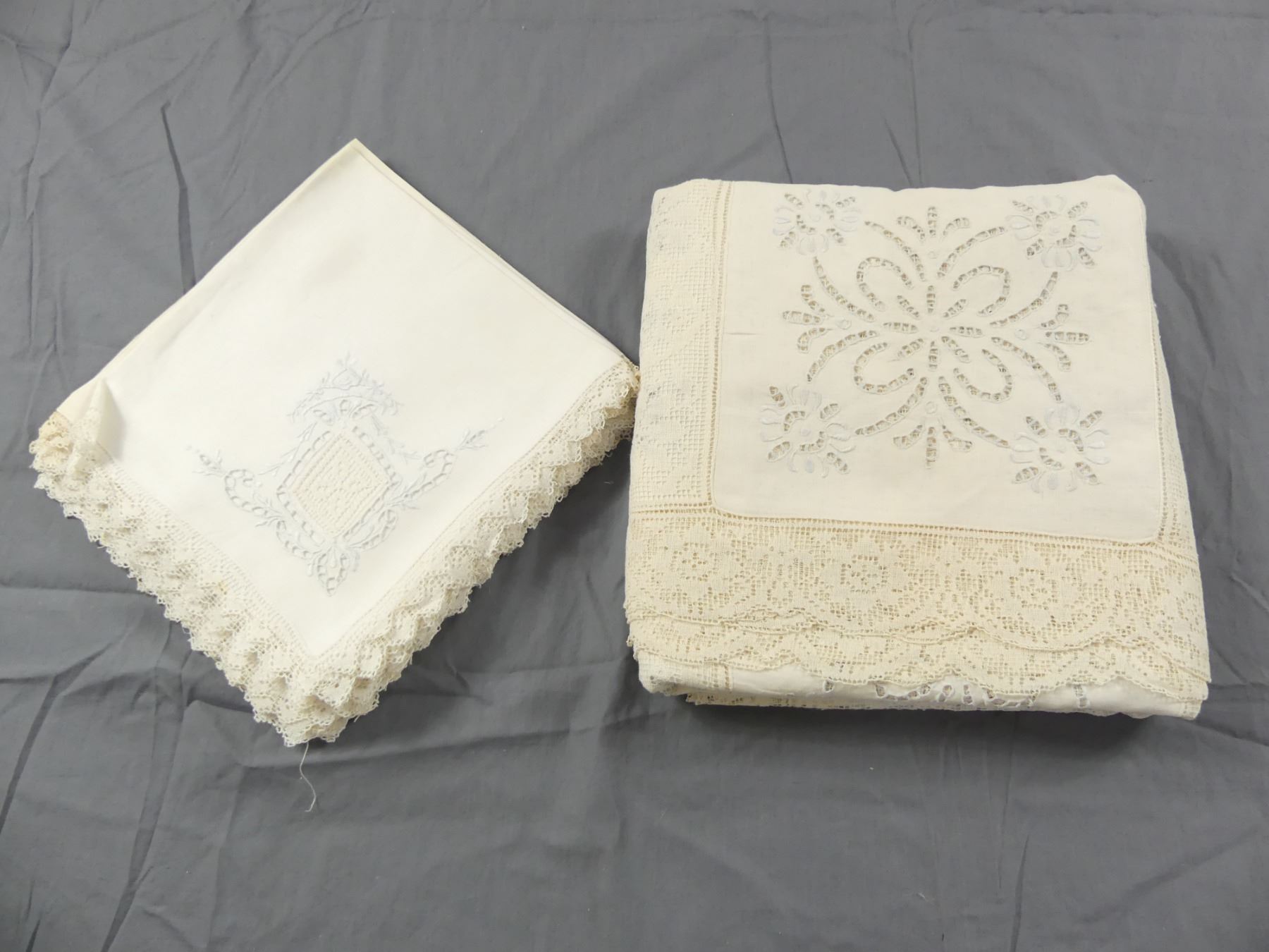Beautiful Linen & Lace Army/Navy Embroidered Cut Work Tablecloth with 12 Napkins