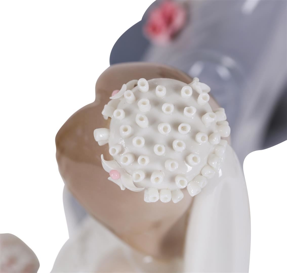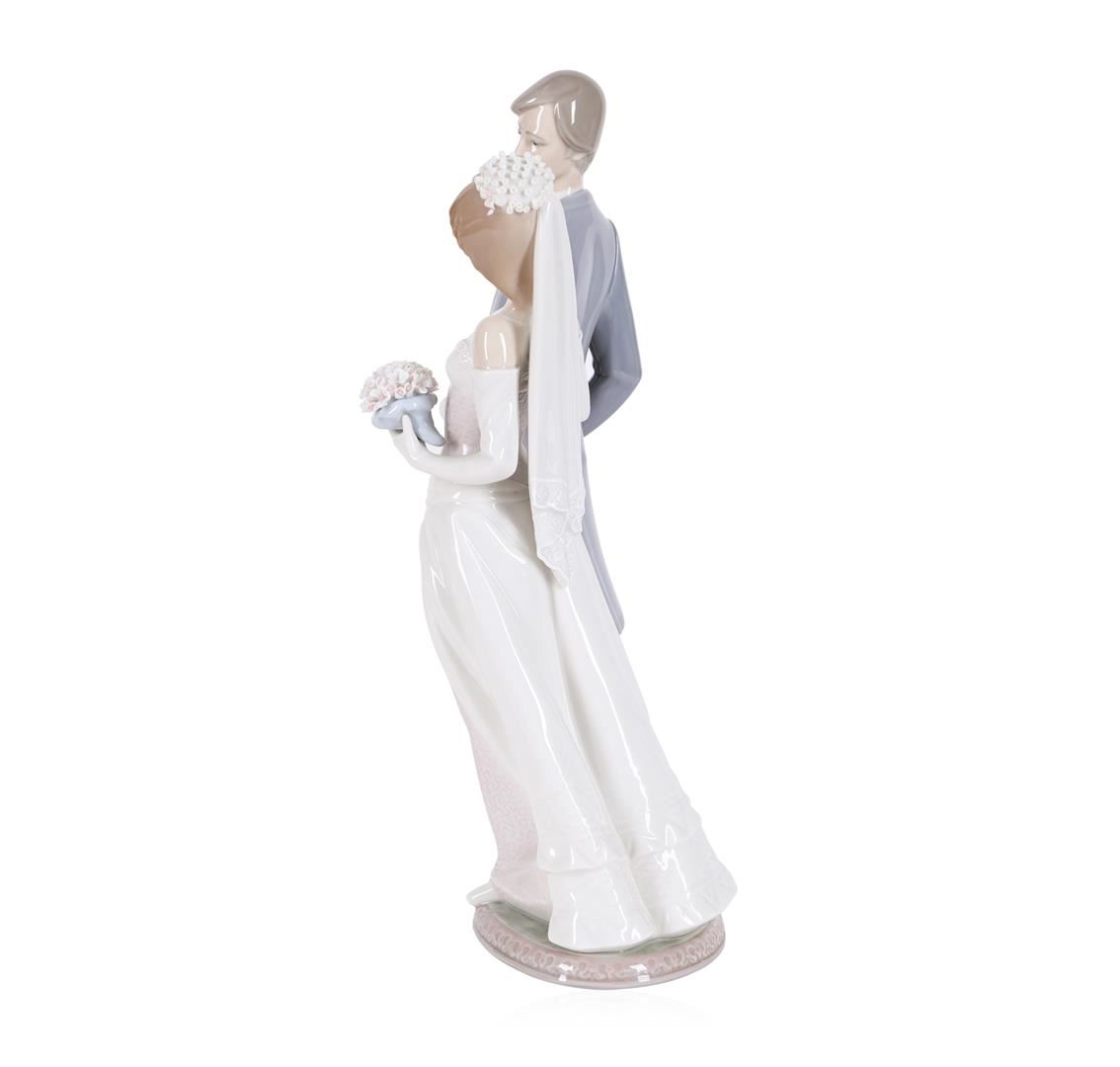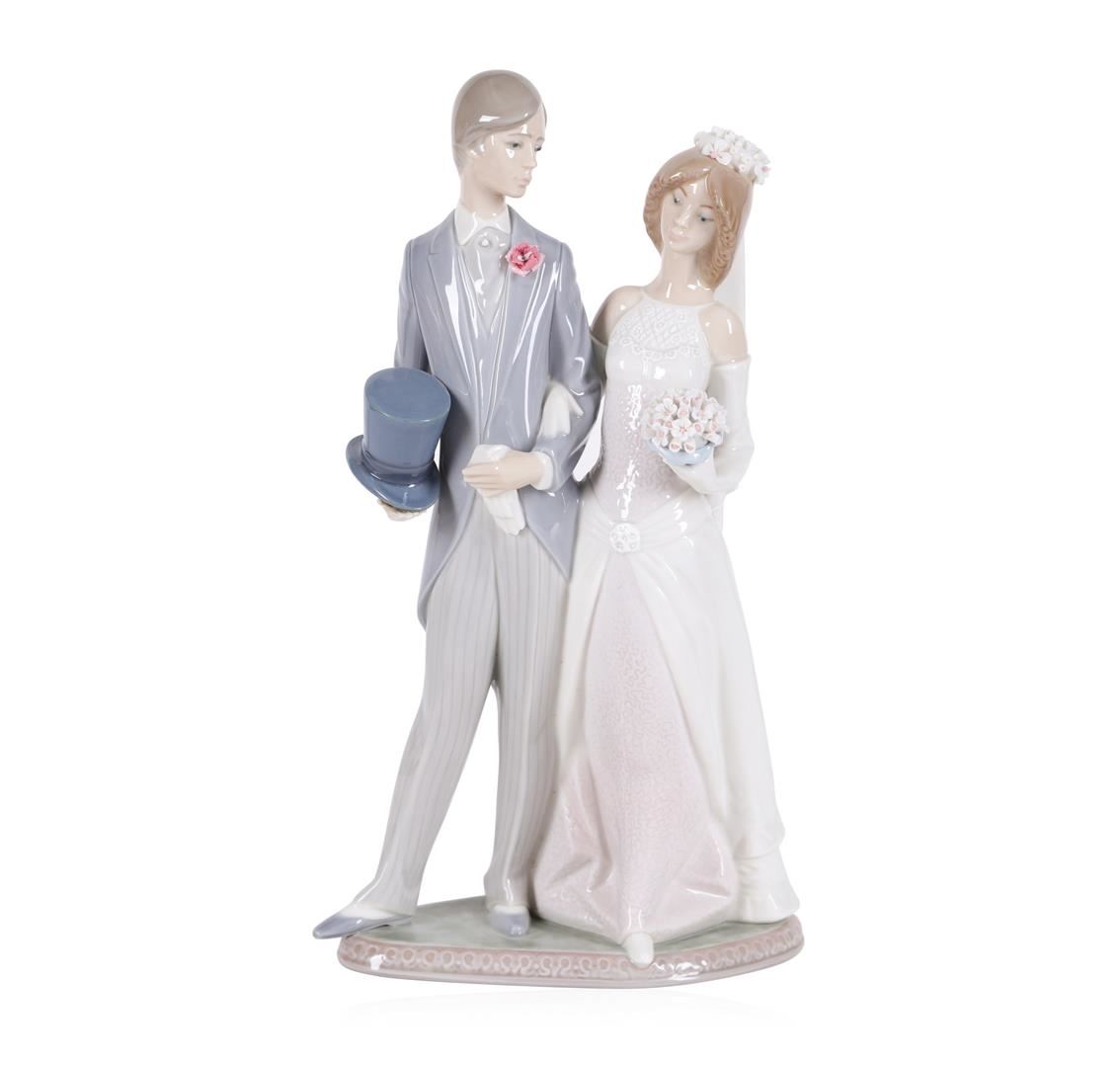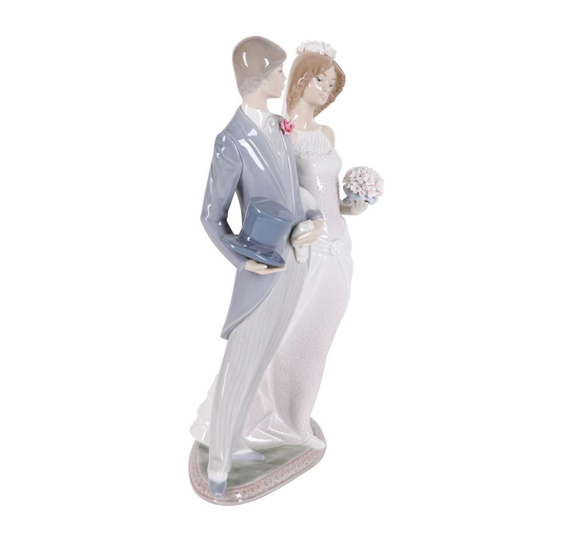 Beautiful Lladro "Bride and Groom" Retired #1404 - 12.5" Tall. Please see all pictures to determine overall condition. An absolute beautiful piece to add to any collection and also makes a great wedding present. This does not come with the original box. Condition is overall very good with a few petals missing from the bride's hat.