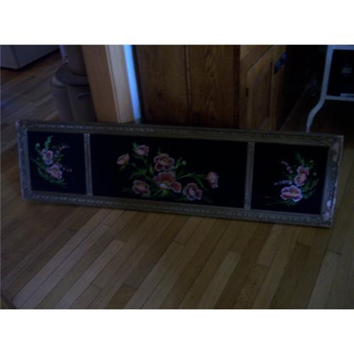 This is a beautiful painting of flowers on velvet.The painting is in wonderful condition but as you can see the frame has quite a bit of damage.The lady I purchased this from,told me it was painted many years ago by a Mr. Jacobus Wyss from Nebraska.It measures 57" by 15 1/2".Wonderful colors.