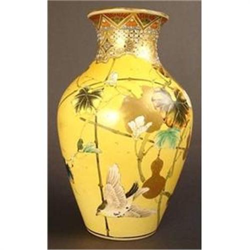 A Splendid Meiji Period (circa 1890) Japanese Vase with overglaze enamel decoration by the very well known potter, Taizan Yohei IX. Giesela Jahn's fine book, Meiji Ceramics, shows a pair of vases by Taizan that are identically decorated. Taizan was a renowned Japanese potter who exhibited at a number of international events, including the 1893 Chicago World Expo. This is a very good example from a great studio potter of the Meiji Period, with auspicious symbols of