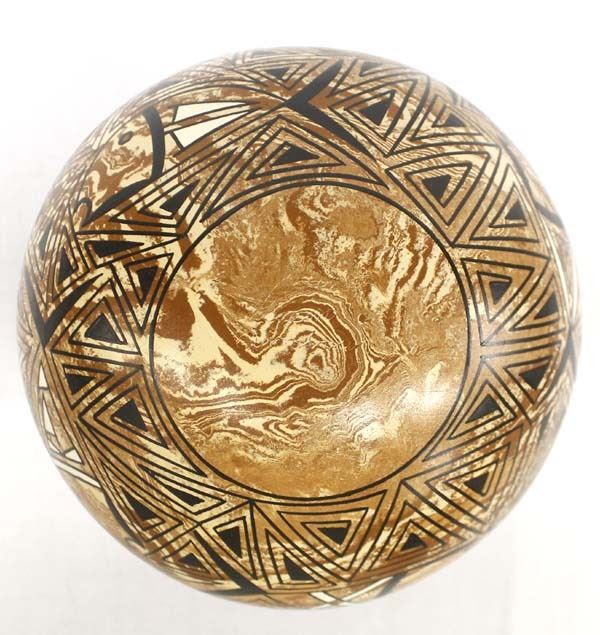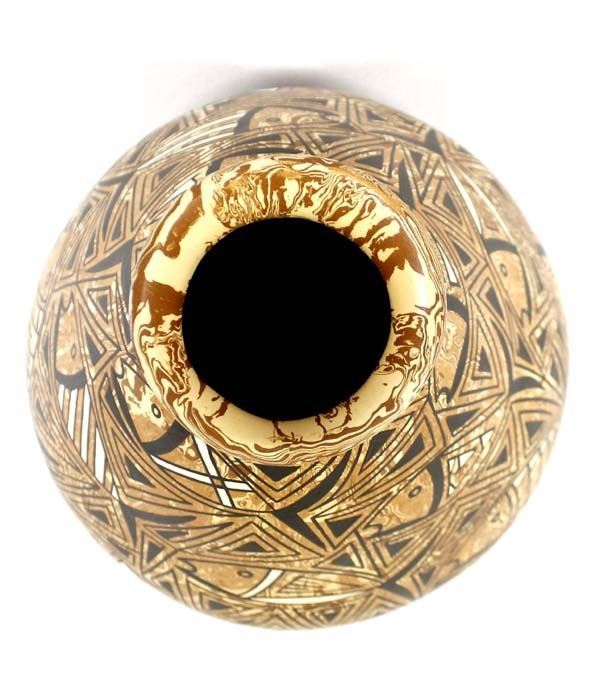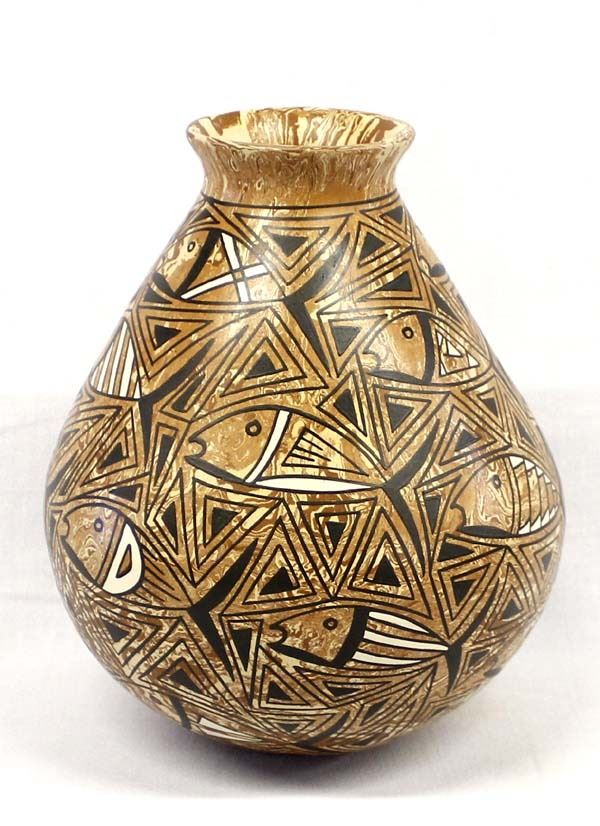 Beautiful Mata Ortiz Marbleized Clay Eye Dazzler Jar by Efrain Lucero Andrew, flared rim, fish motif, measures 7.5'' x 9.5'' and is signed on the bottom
