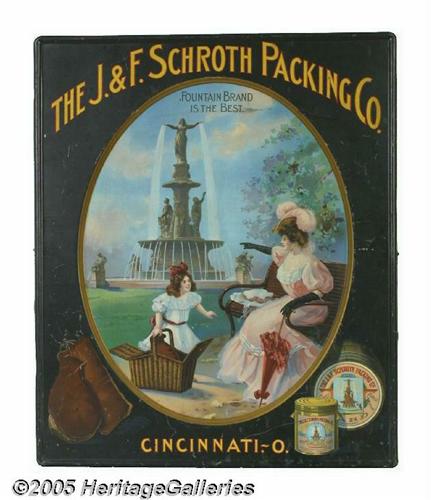<B>Beautiful Meek Co. Lithograph Advertising Sign</B></I> Produced for the J. & F. Schroth Packing Co. its detailed scene pictures Fountain Square in Cincinnati, a turn of the century place for picnics and family gatherings. Here a Victorian mother is picnicking with her daughter in front of the fountain. The tin sign is very graphic depicting even the smallest detail in their Victorian clothing and lifestyle. The fountain was often used by Cincinnati businesses as a focal point for their ads, as it had such a strong association for the people of Cincinnati and visitors alike. One of the finest advertising lithographers of the turn of the century was the Meek Co. of Coshocton, Ohio, well known for its deep coloration in its tin lithographs. This piece is no exception. The sign, never having surfaced in any other auction we can find, has some minor scratching to the dark black frame-like border. We will mention here that there is one scratch, which only appears after very close examination, across the woman's face. The scene evokes a different time, and nothing detracts from it. 20 1/4" x 21 1/2". Lot:252