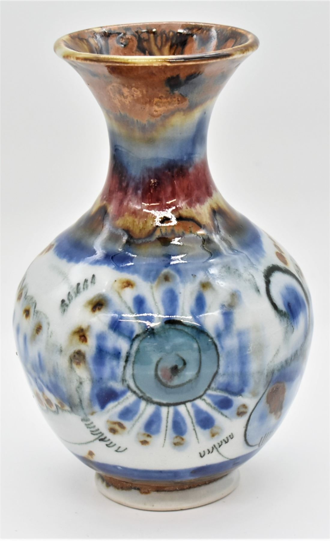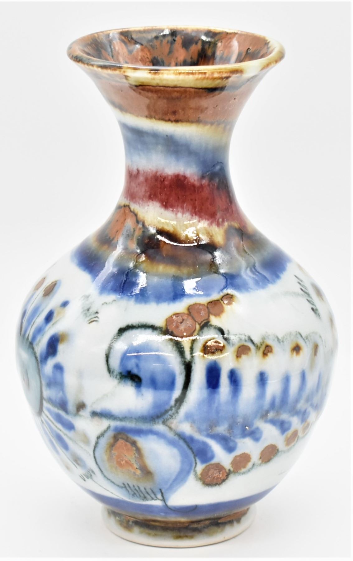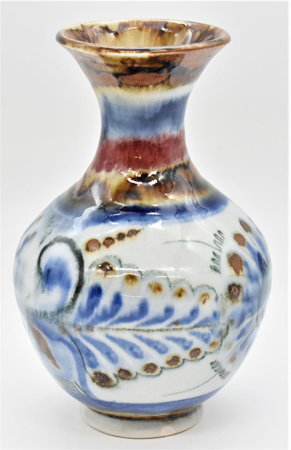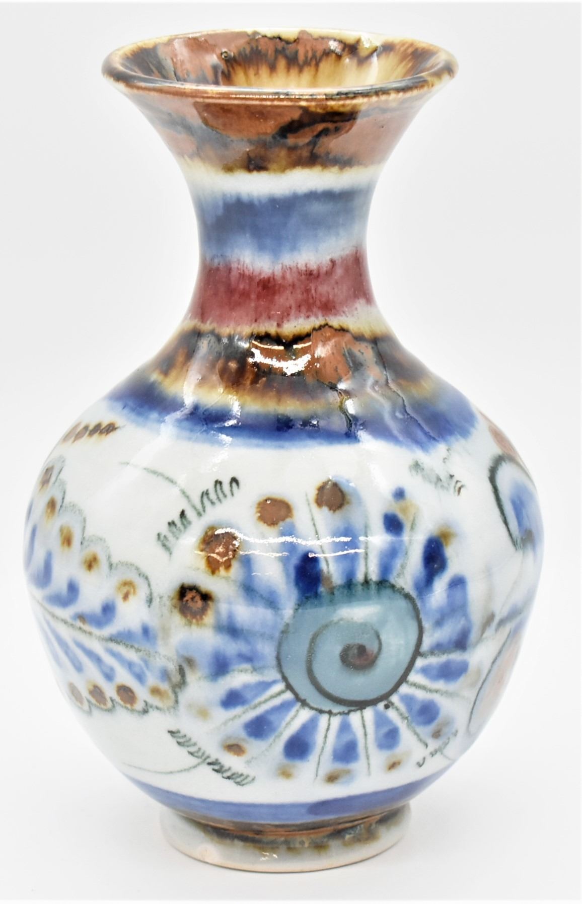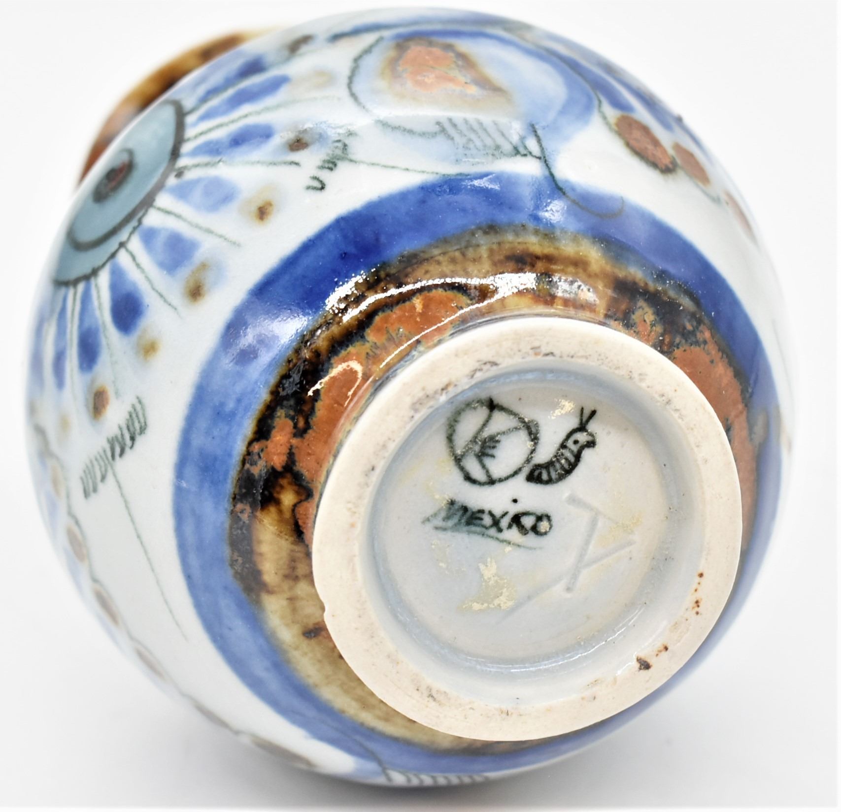 Beautiful Mexican Tonala Ken Edwards Pottery Vase, measures 4.5'' x 6.25'' and is signed on the bottom, FYI: ''In the 1960's Ken Edwards migrated from the United States to the crafts village of Tonala, in Central Mexico, where he founded the company known as Ken Edwards Stoneware. The Museo Regional de la Cer mica (Regional Ceramic Museum) inTlaquepaque, Jalisco, Mexico is located on Independencia Street in the center of the city. The museum is one of two main ceramics museums in the city, with the other being the Pantaleon Panduro Museum . A chronology of the works of Ken Edwards can be seen there showing the progression of his craft. It is quite an honor to be included in this museum. His works from the 1960's to present day can be seen here.''