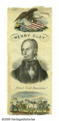 <B>Beautiful Multi-color 1844 Henry Clay Ribbon</B></I> Believed to be the first full-color political ribbon design. Below his central portrait is a vignette of Clay as one of his popular political personas, the Farmer of Ashland (Clay's supporters had clearly learned from the success of W. H. Harrison's 1840 campaign, when the aristocratic Harrison was marketed with images of a log cabin and hard cider barrel. Clay's "farm," Ashland, was in fact a lavish estate, and there is little likelihood he ever did any plowing there!). It is surprising that, after the introduction of this lovely design, it would be decades before colorful designs came into wide use, making this variety stand out in its genre. Condition is great, but it has been trimmed at the top and bottom, to a sufficient degree to materially affect fair market value. But a terrific Clay centerpiece none the less. Worth in the mid-two thousands range if complete. Length 6.25". Lot:256